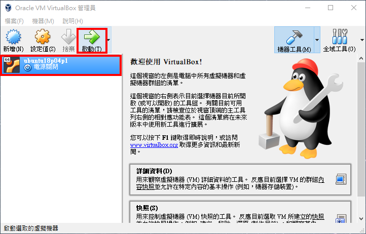 點選【ubuntu18p04p1】→ 點選【啟動(T)】。