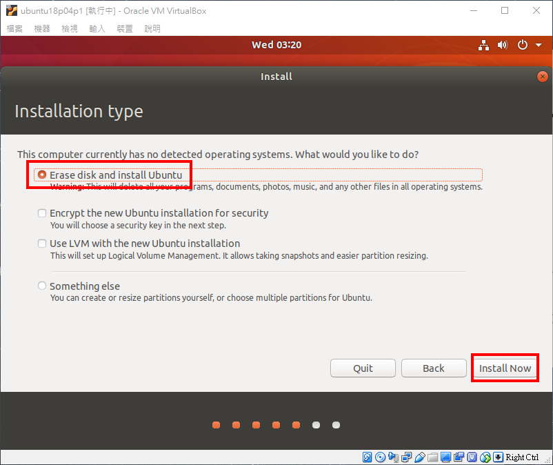 點選【Erase disk and install Ubuntu】→【Install Now】。