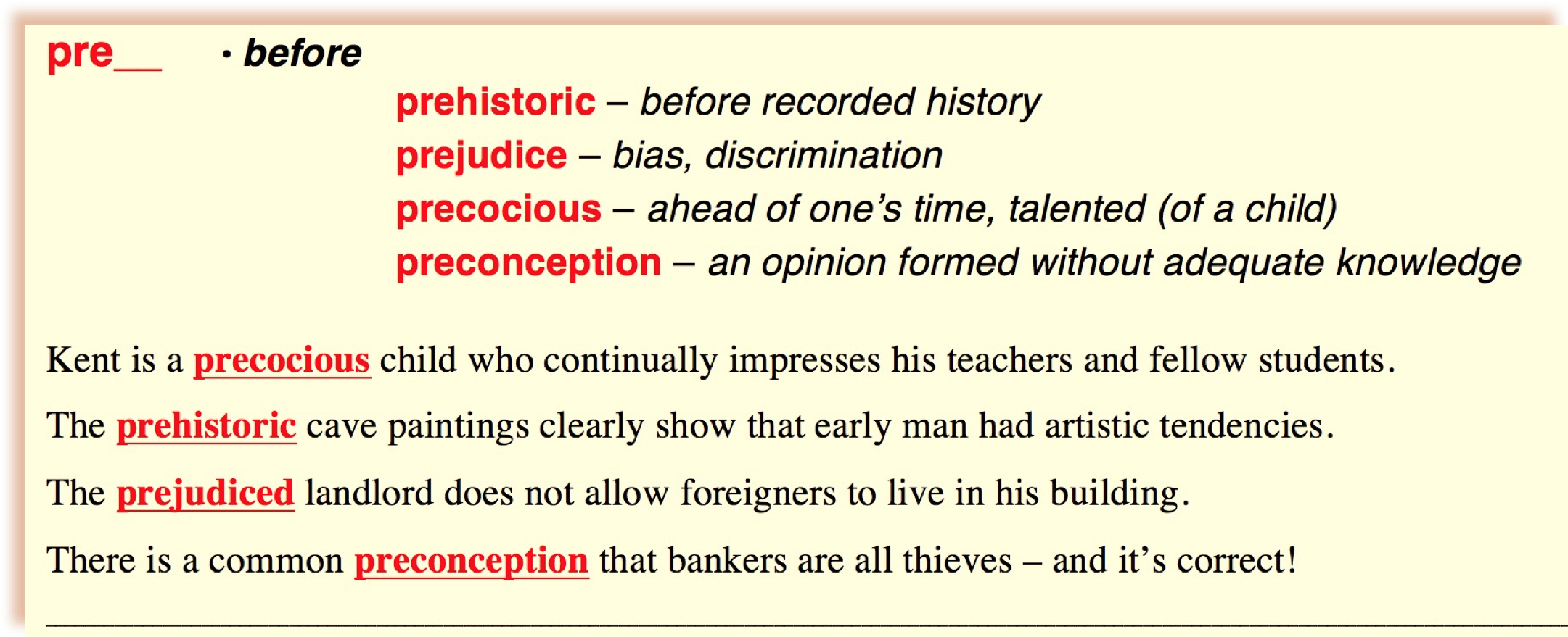 Vocab-ability Prefix–308 (pre__ = before) – A More Powerful Vocabulary (earn UpVotes with “Vocab Practice” exercise)