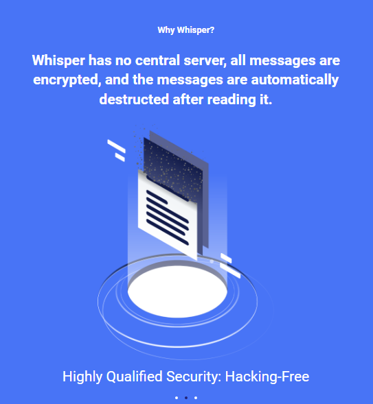 Whisper is a fully encrypted messenger secured by blockchain technology. It is a very sophisticated app that has a lot of features, some of which are: