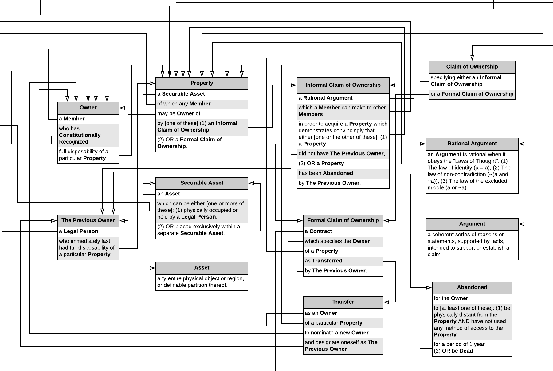 All the standard ideas of property are expressed here. It can be owned, but only by Members, who (explained below) are those who have accepted the constitution. Property is only defined for people in the Zeroth society, or put another way, only those who have accepted the constitution can have it protect their property rights. Defined are what a property is, how it can be claimed to be owned and by whom.