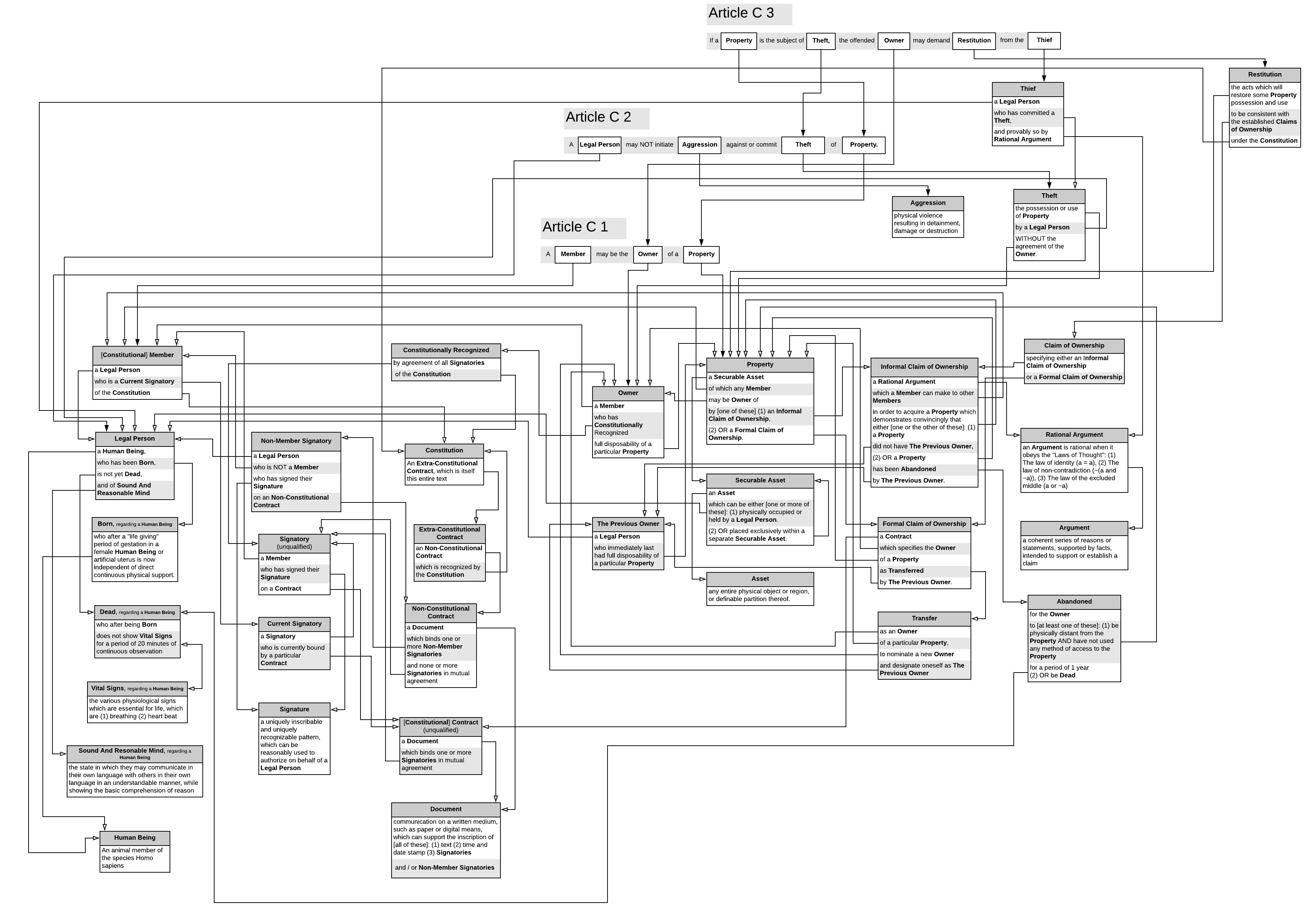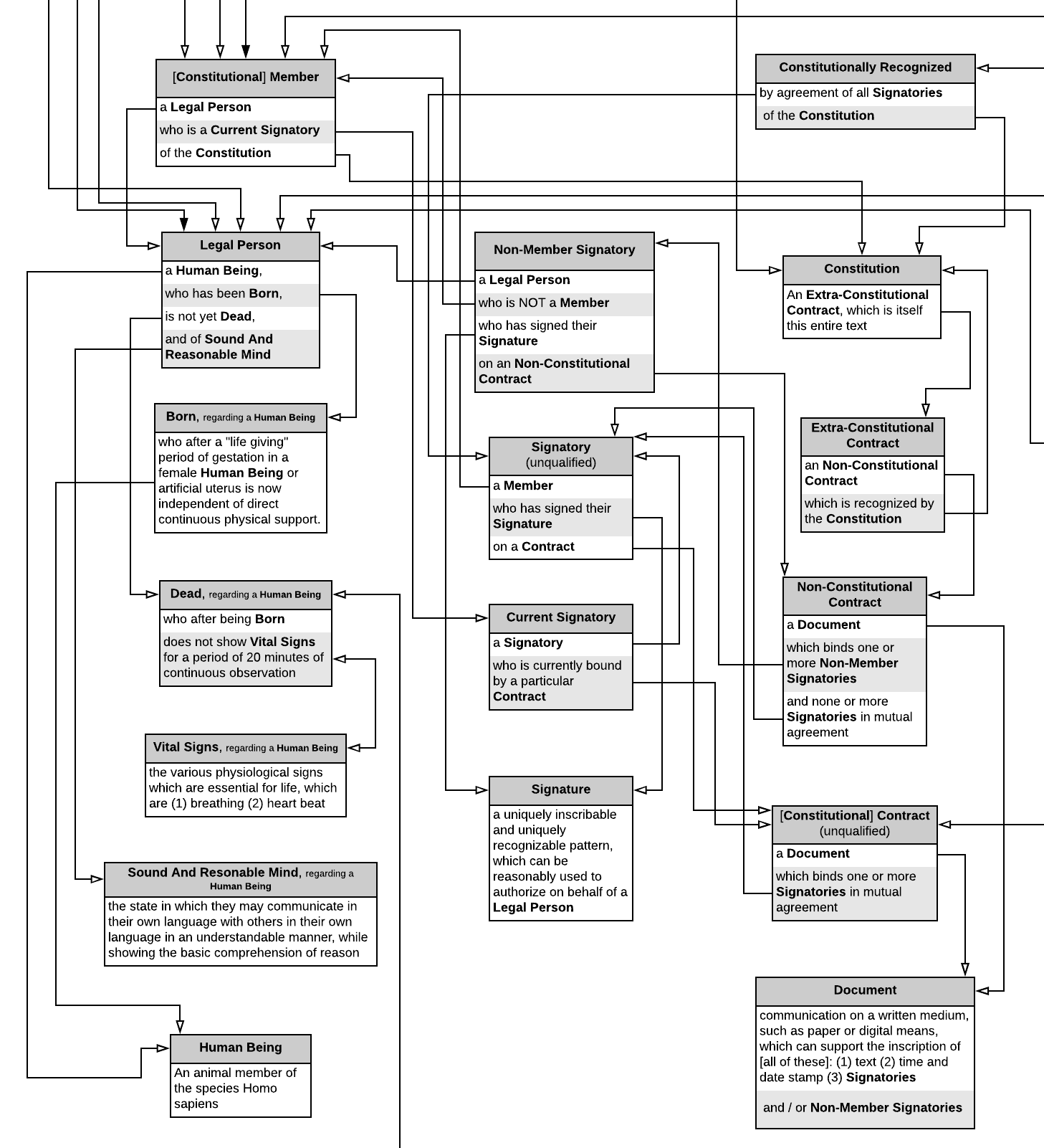 We can clearly see the relationships between definitions. In particular the definition of a "Legal Person" is broken up into three characteristics, one of which depends on yet another definition.