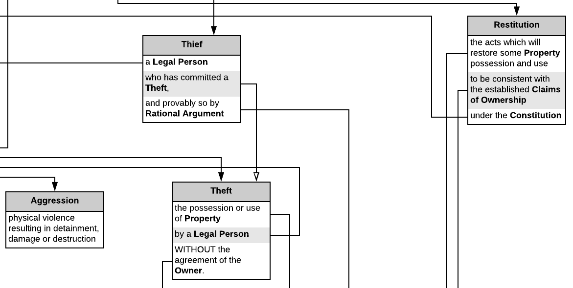 I think if you're going this route all subcomponents and terms should be delved into as well. "Legal Person may NOT initiate Aggression against another Human Being, unless the other is Right Now Aggressing against them .." --> initiate is undefined and is a subjective act that falls within a spectrum, ie. I will kick your ass if you look at my wife the wrong way: in that I'm initiating the physical confrontation by some standards but by others you have initiated the entire exchange by looking at her the wrong way.