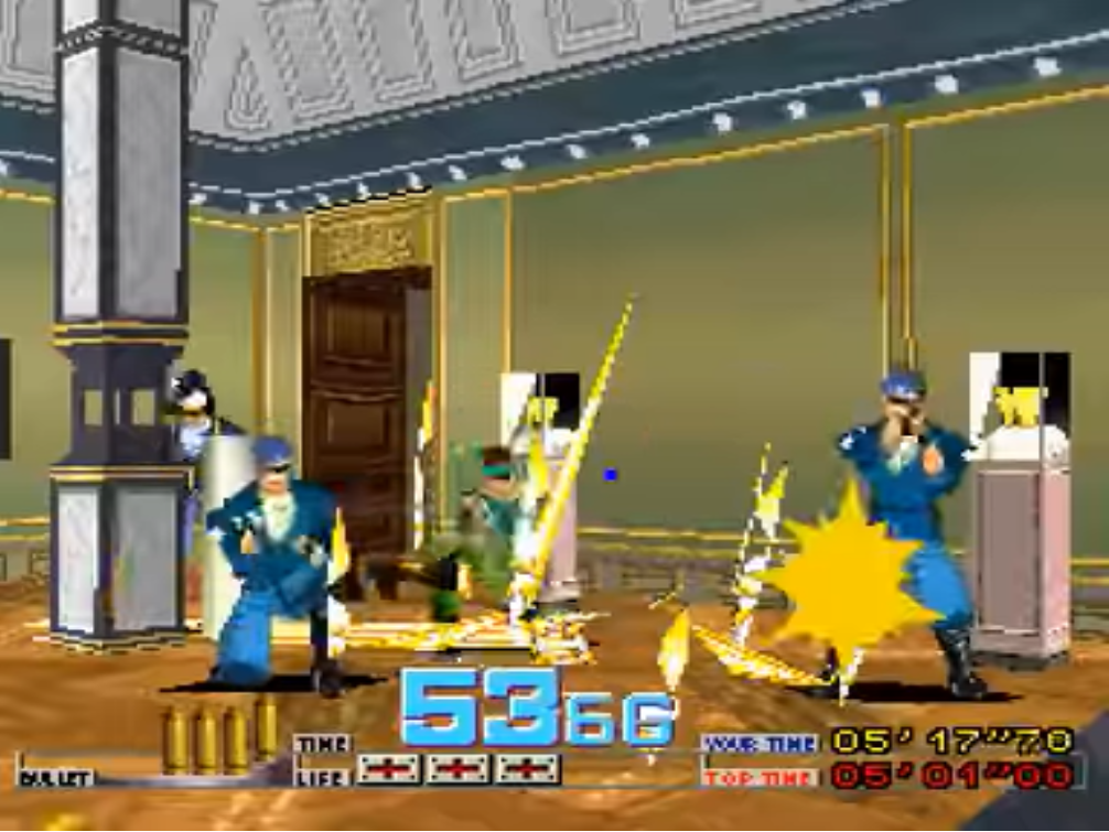 Auch die PSX (Playstation 1) zeigt mit der Namco G-Con 45 bereits wie man virtuelle Waffen natürlich steuern konnte. Mit der Plastikwumme in der Hand zielte man auf eigentlich nur Pixelbrei (siehe Bild Time Crisis PSX unten), das Gefühl dabei war aber ungleich besser zu einem Joypad.