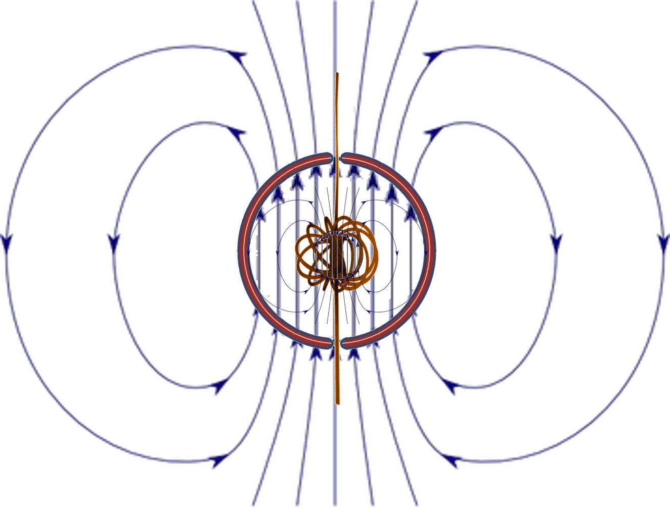 And finally, to an electric coil inside a hollow sphere magnet, the two bodies locked at rotational axis by electromagnetic attraction, with repulsion along equator and sides.