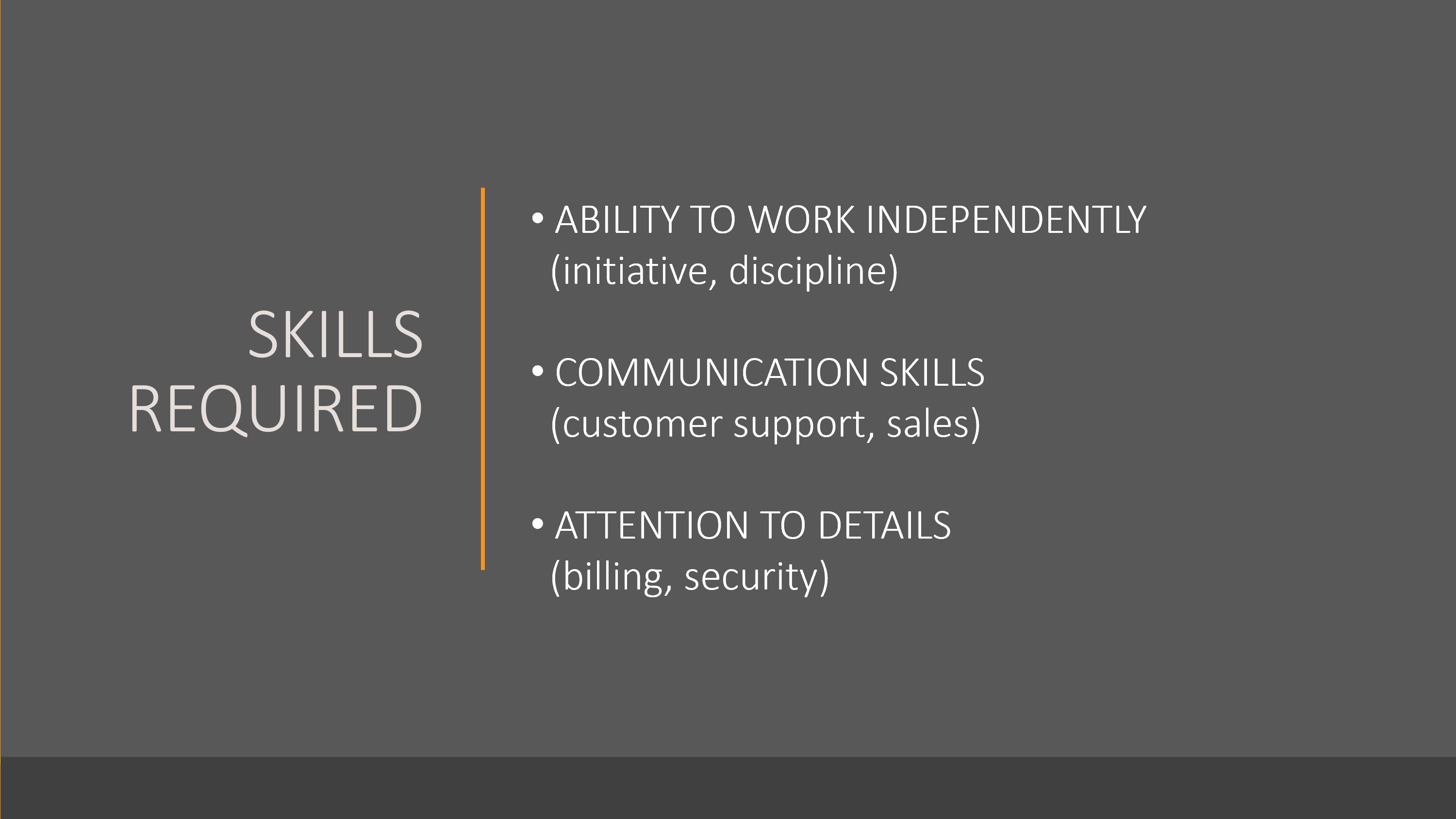 When we are reviewing the skills required to operate such a business, ability to work independnently and attention to details are a must. It is important to issue invoices on time, promptly process payments to reviewers, update restaurant menus, motinor reviews and provide reports to restaurants.