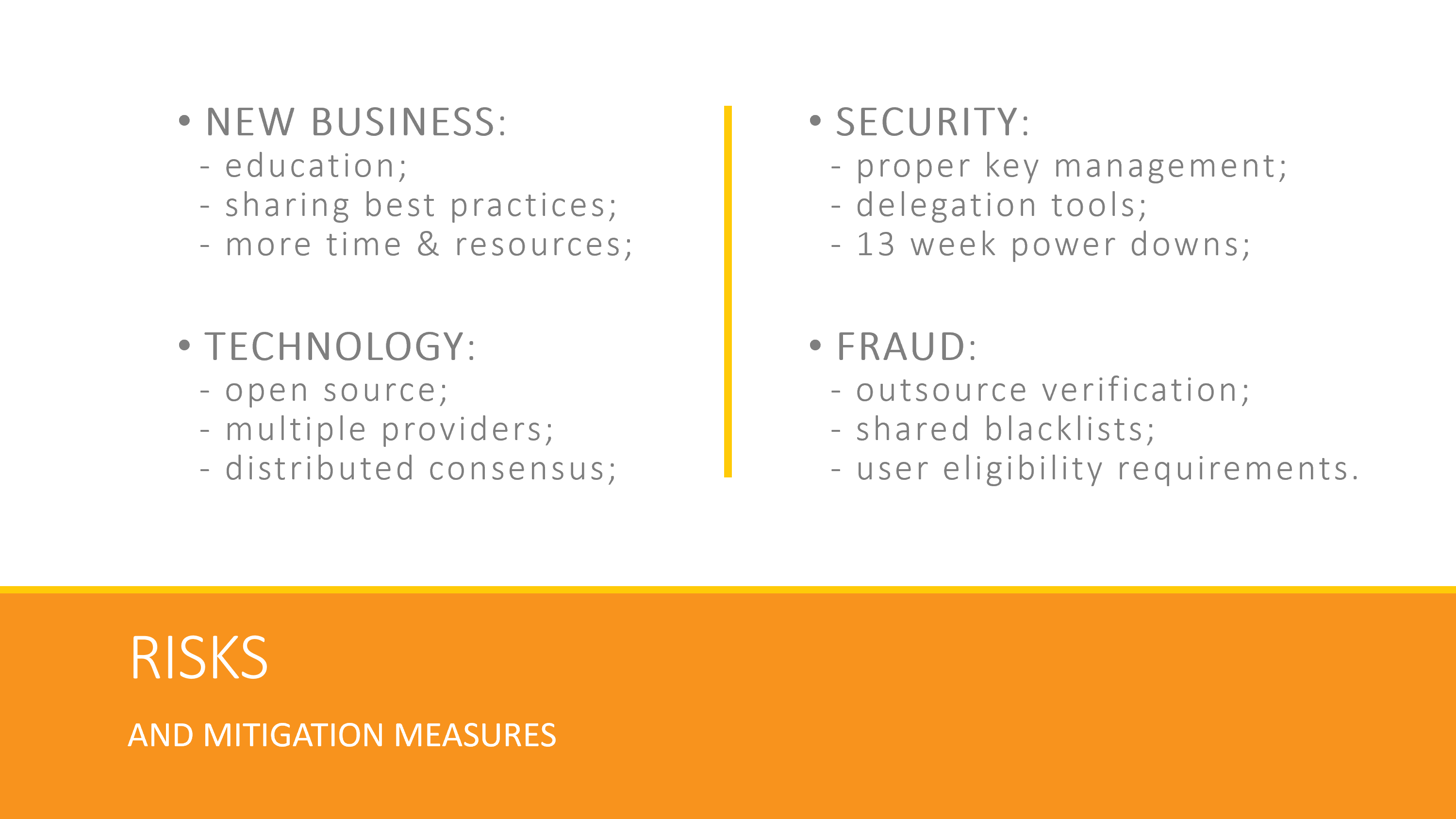 New technologies can have errors, inefficiencies or lack of the required features. The active use of private keys for processing crypto payments also poses security risks, as all payments are final and cannot be reversed. Appropriate security protocols must be implemented (management of hot and cold keys, minimization of cash in operating accounts, delegations, power-ups, VPNs and more).