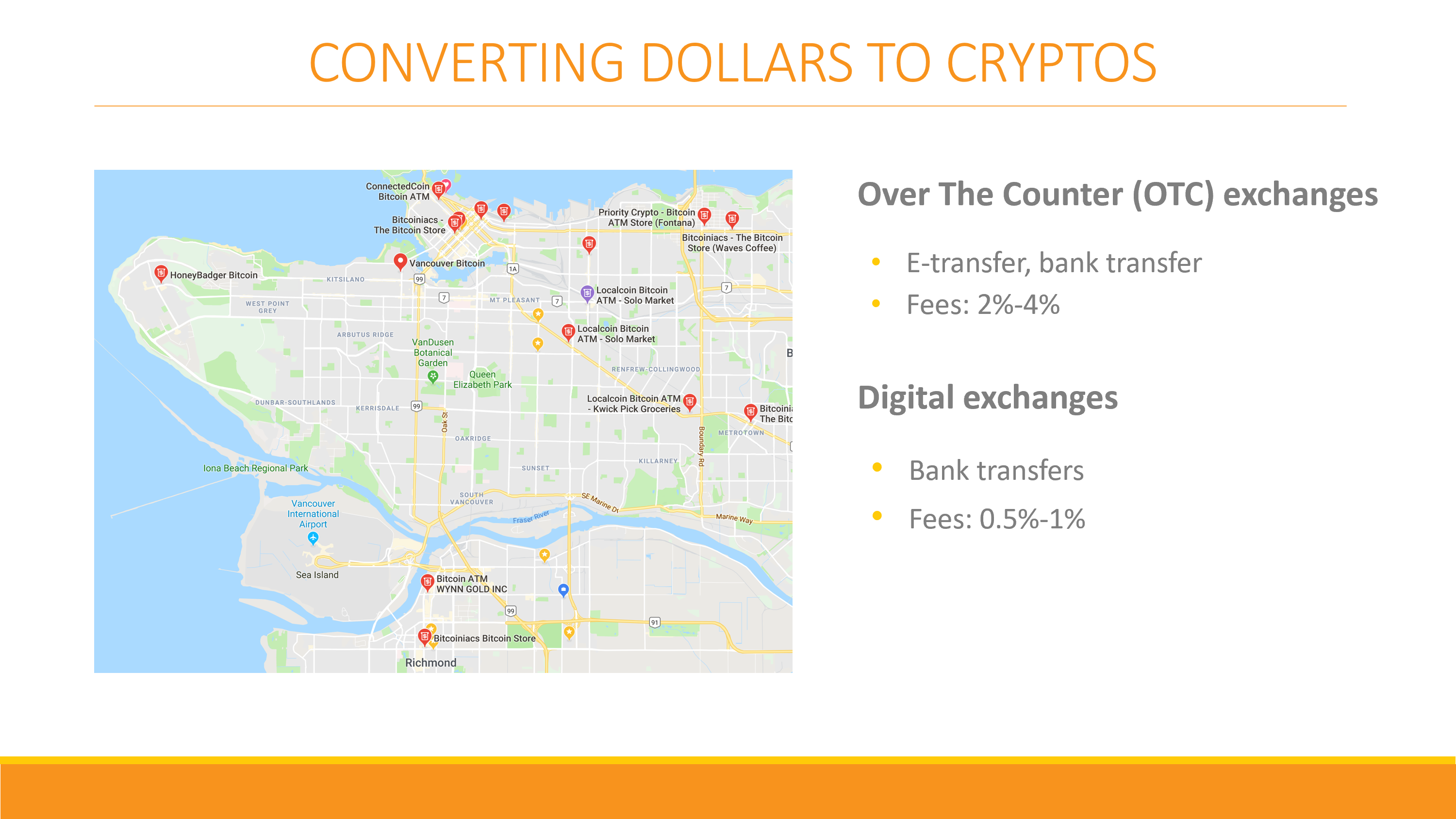 There are many convenient ways to exchange regular currencies into cryptos. Here in Vancouver we have many Over The Counter (OTCs) exchanges that provide services to businesses. They accept e-transfers and make spot price conversions into the specified crypto and deposit it into the pre-registered account. Once the process is established, it works instantly and on demand.