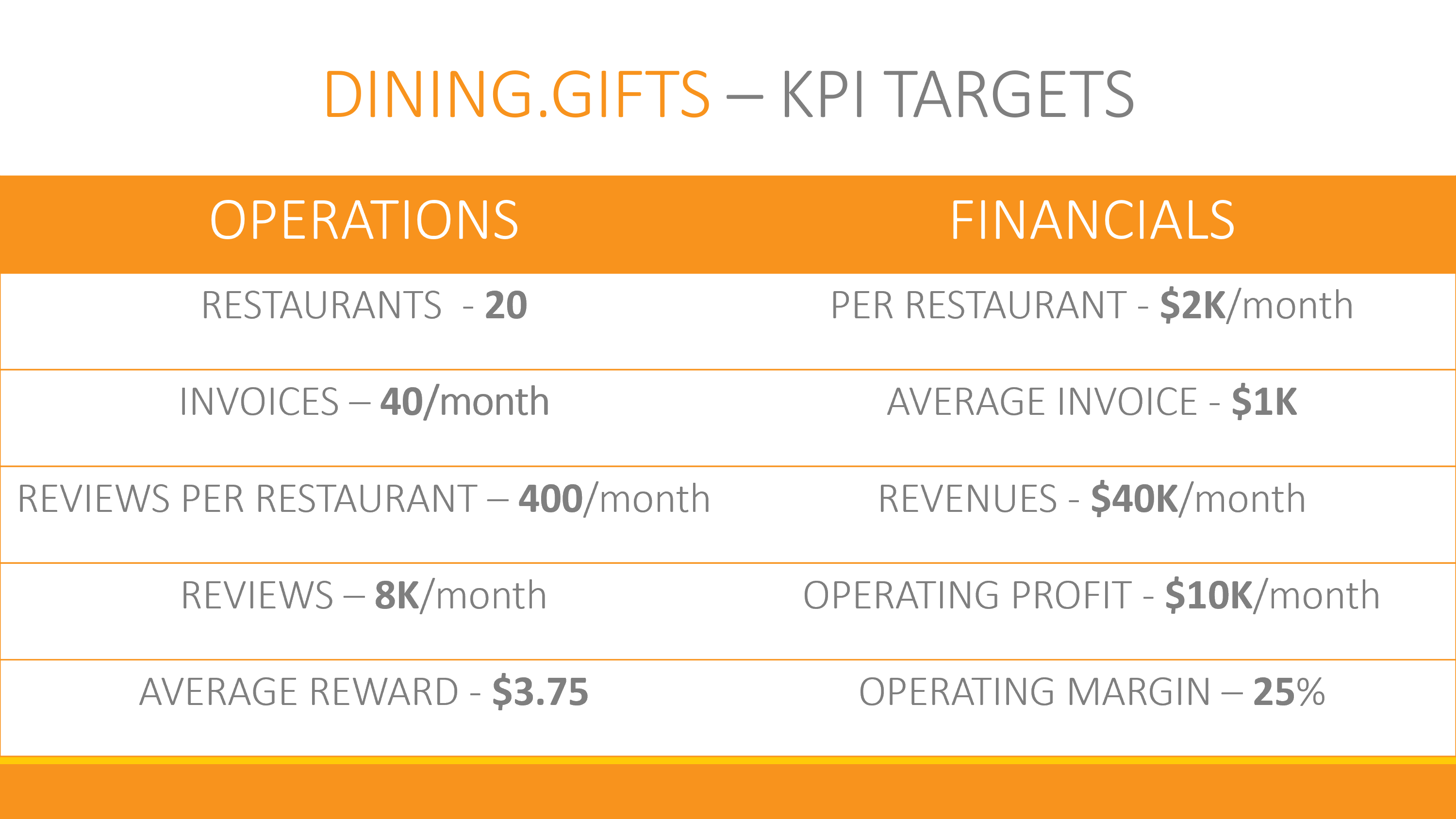 The next slide lists some key performance indicators (KPIs) and estimates for a one-person operation providing services to 20 average-sized restaurants. Such a business is expected to generate $40,000/month in revenue and $10,000/month in operating profit (these estimates do not include additional crypto revenues).