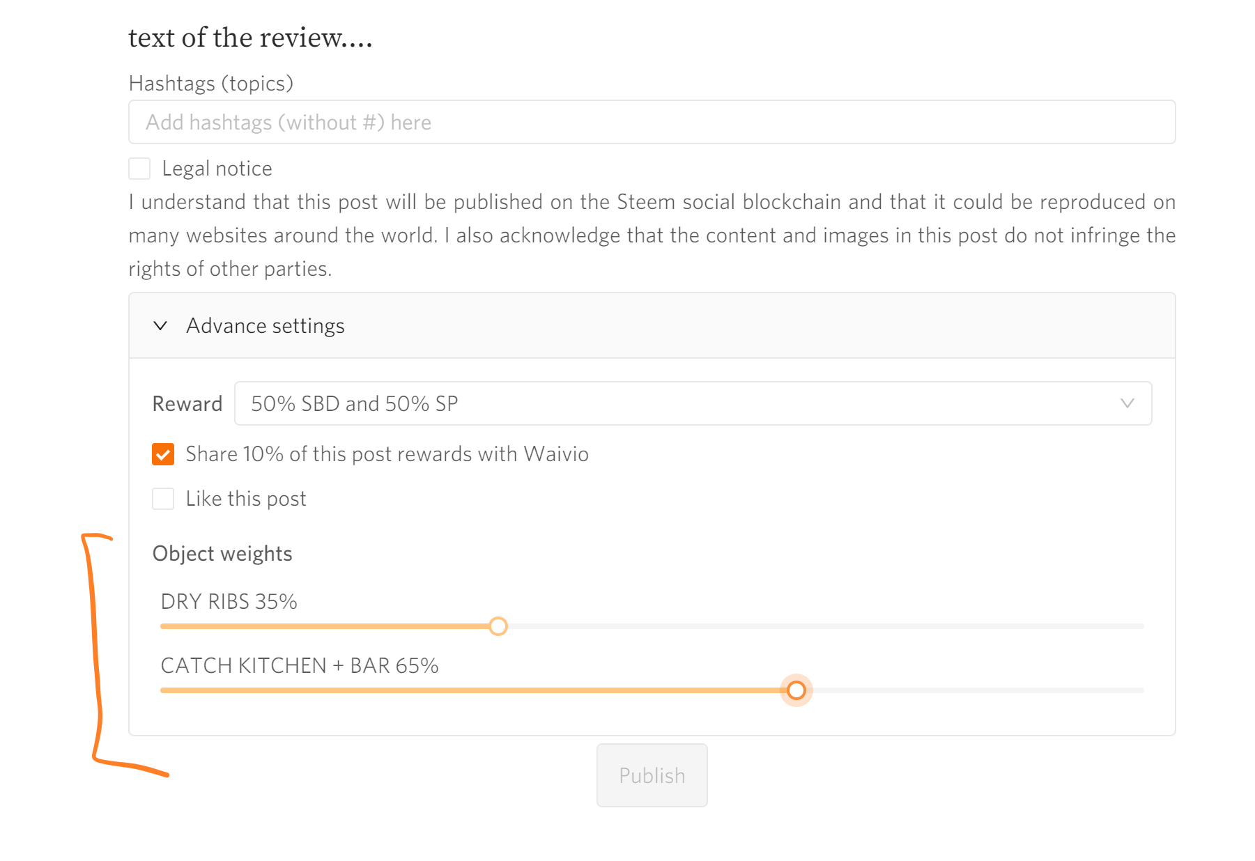 As you may know, Waivio supports wiki-listings/lists/pages on Steem blockchain - we call them objects. And when you submit a post through Waivio, you have an option to edit assigned weights:
