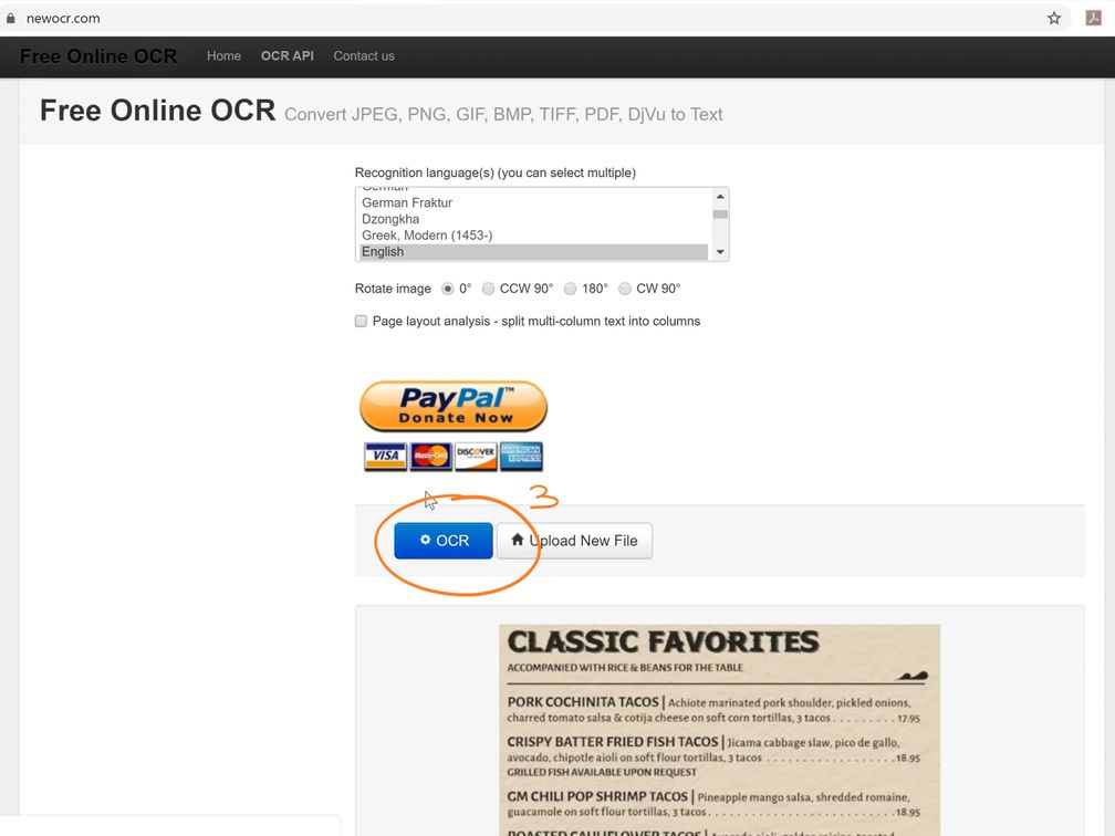 There are many OCR services available online. In this example we are using NewOCR.com