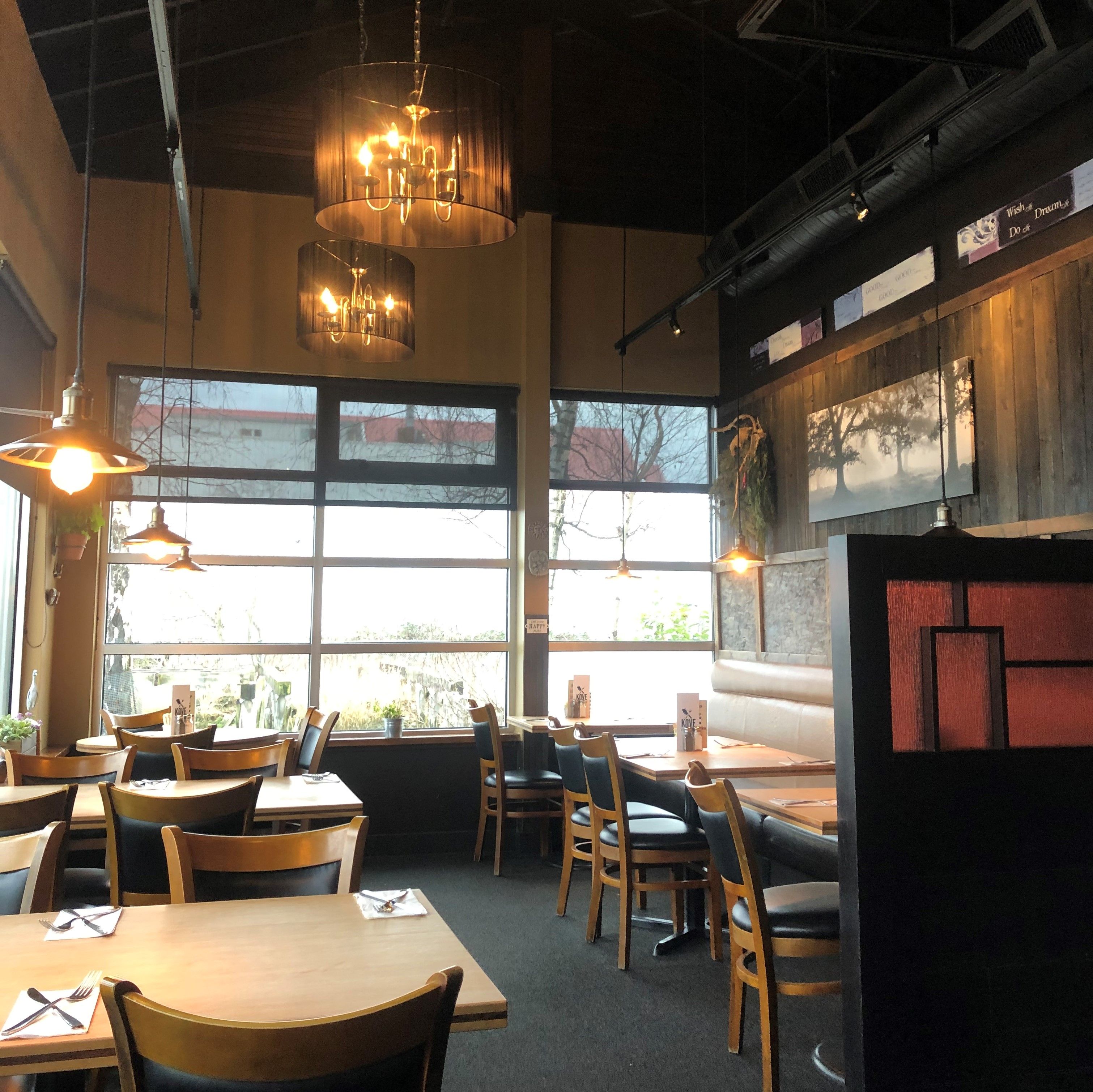 The modern and peaceful decor of Kove Kitchen provides a pleasant atmosphere right in the heart of Steveston. With caring and attentive staff I would be confident to say you and your company would be guaranteed to have a pleasant and relaxing experience. With a view that faces directly the Steveston marina and market it is truely a beautiful place. With a large seating capacity and bar as well.