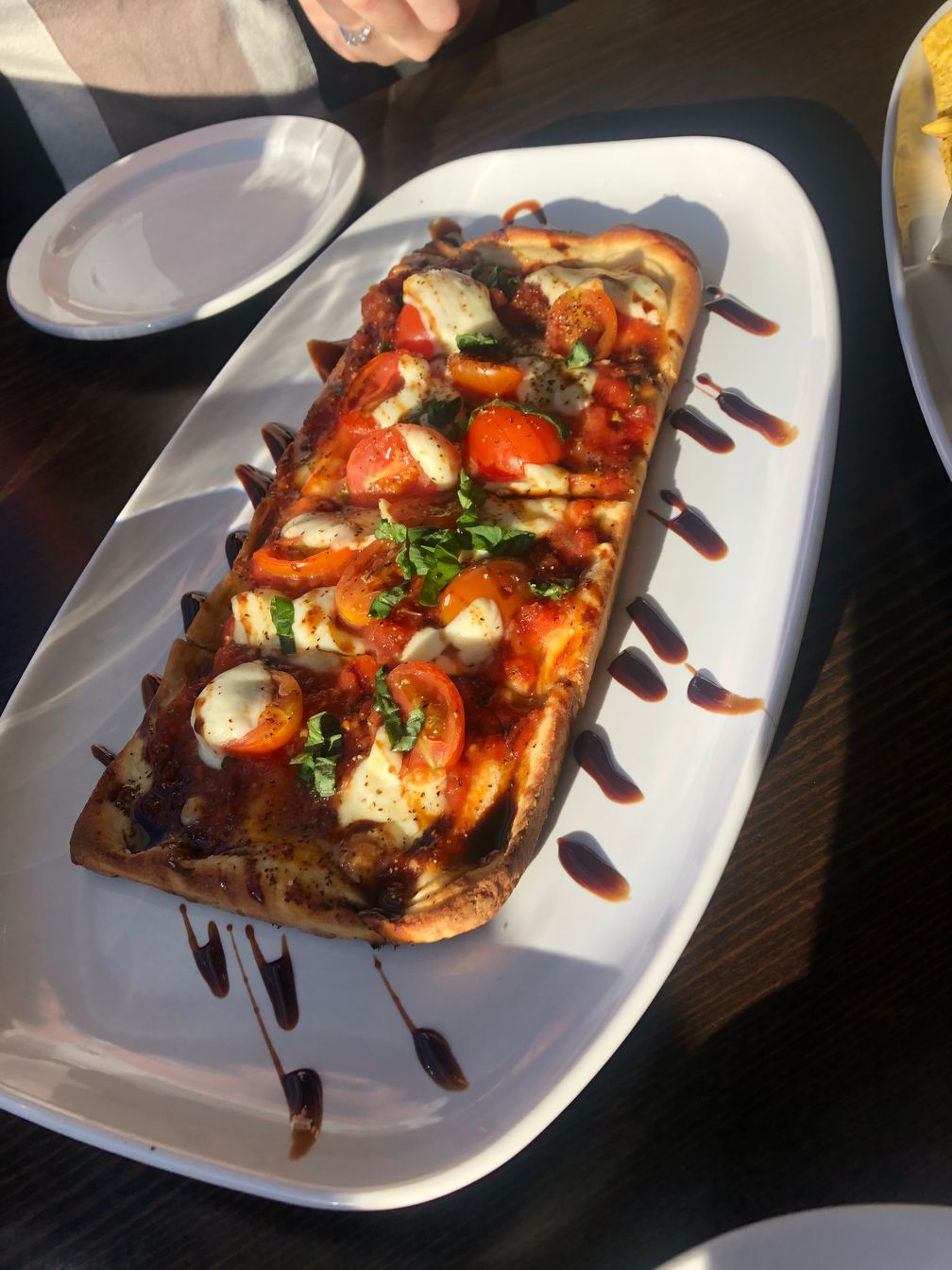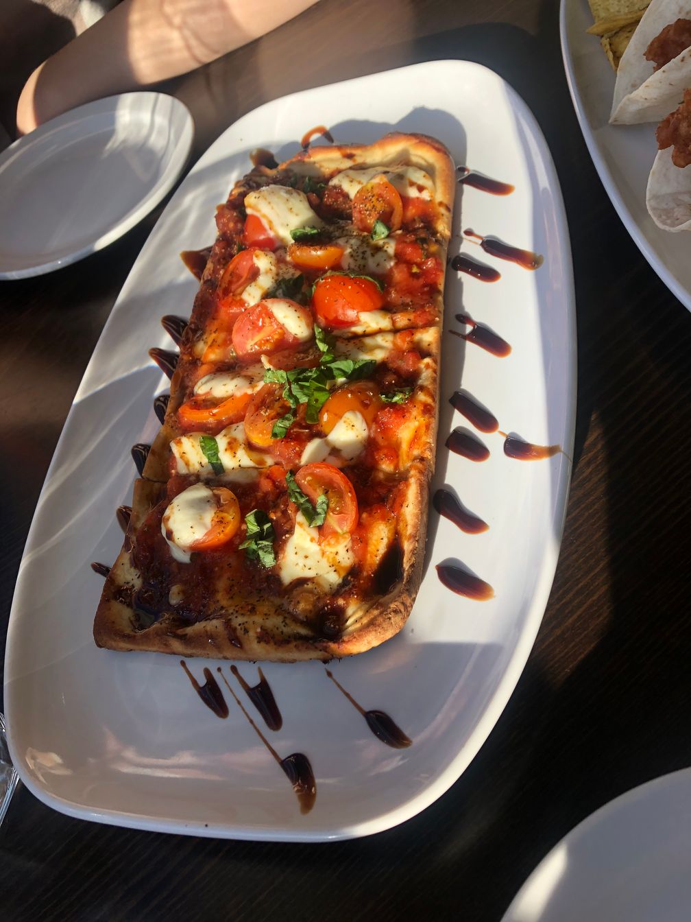 The Mediterranean Flatbread is a great option on the happy hour and appi menu at Catch Kitchen + Bar. delicious house-made crust with mozzarella, tomato, fresh basil and a balsamic reductio, providing the classic taste of capresse. Would recommend with a glass of red.