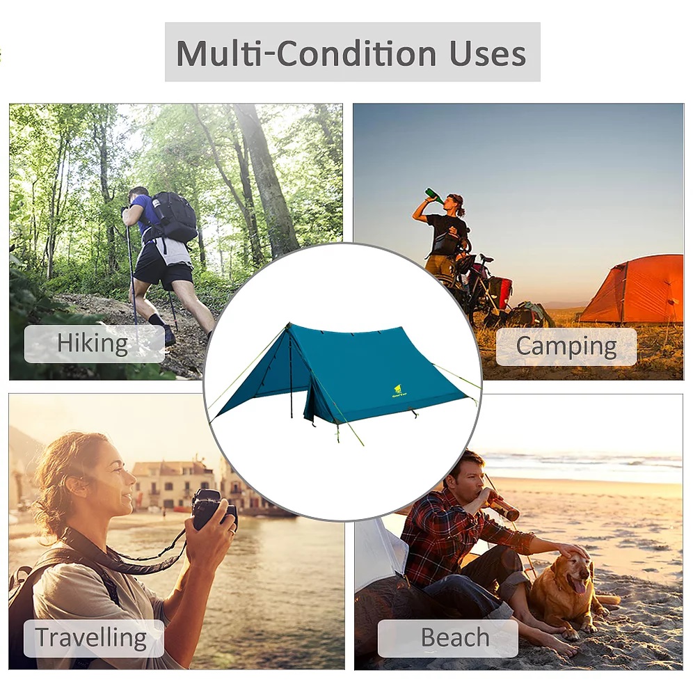 The total weight including fly sheet, inner tent, ropes, pegs and carrying bag is 2.6lb /1.2kg. The flysheet is made of 20D silicon coated nylon, which means it’s not only ultralight, but also 100% waterproof. The flysheet and the inner tent can be used independently of each other. 2 doors and 2 windows add convenience and allow for greater airflow throughout the entire tent, more breathable.