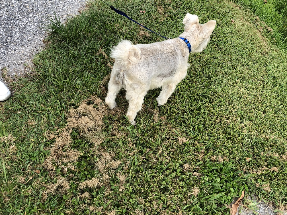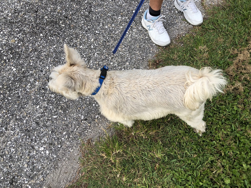 I am still walking when I see this dog with the owner. Or at least the person leading and exercising the dog.