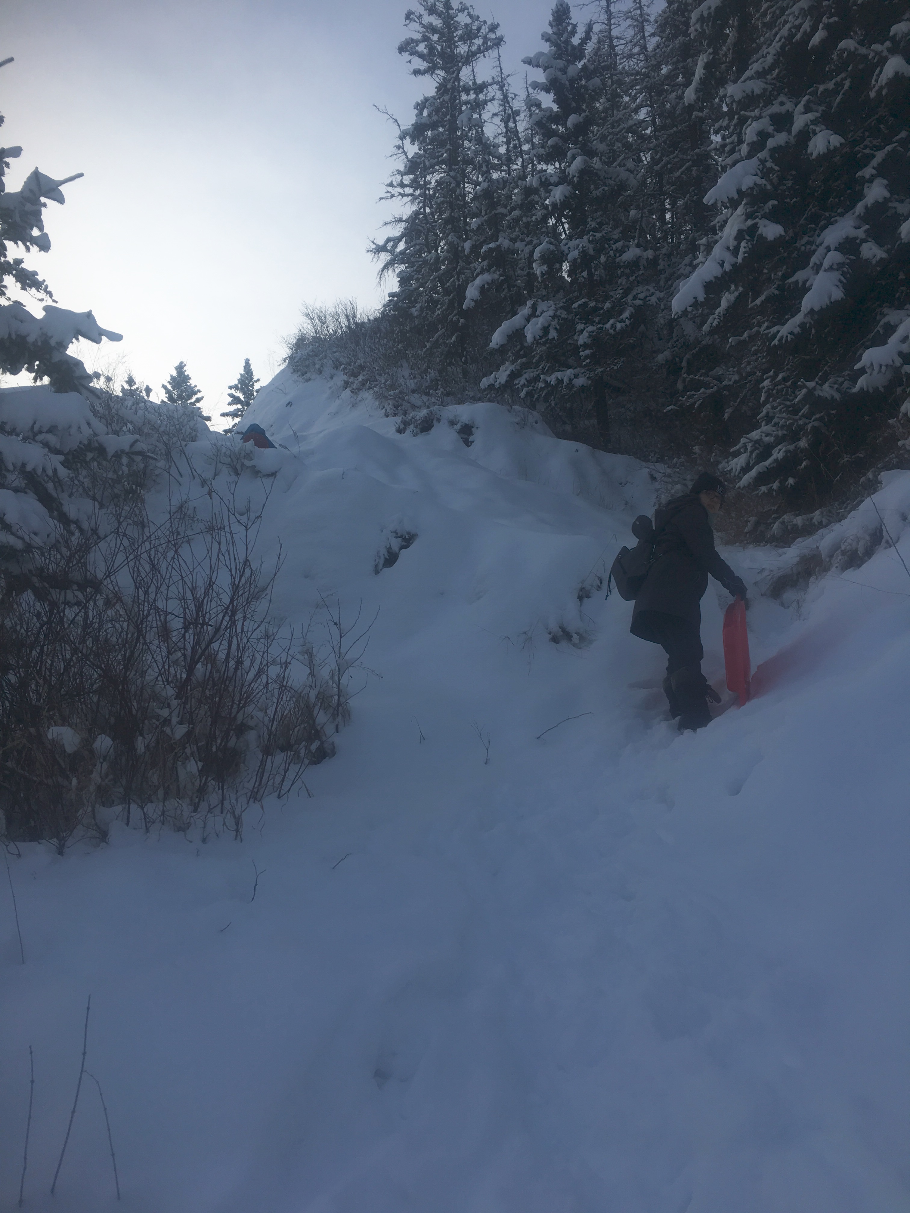 Here we start on our icy adventure with my son taking on the characteristics of an Alaskan husky and pulling his sister along in a sled. Good boy!