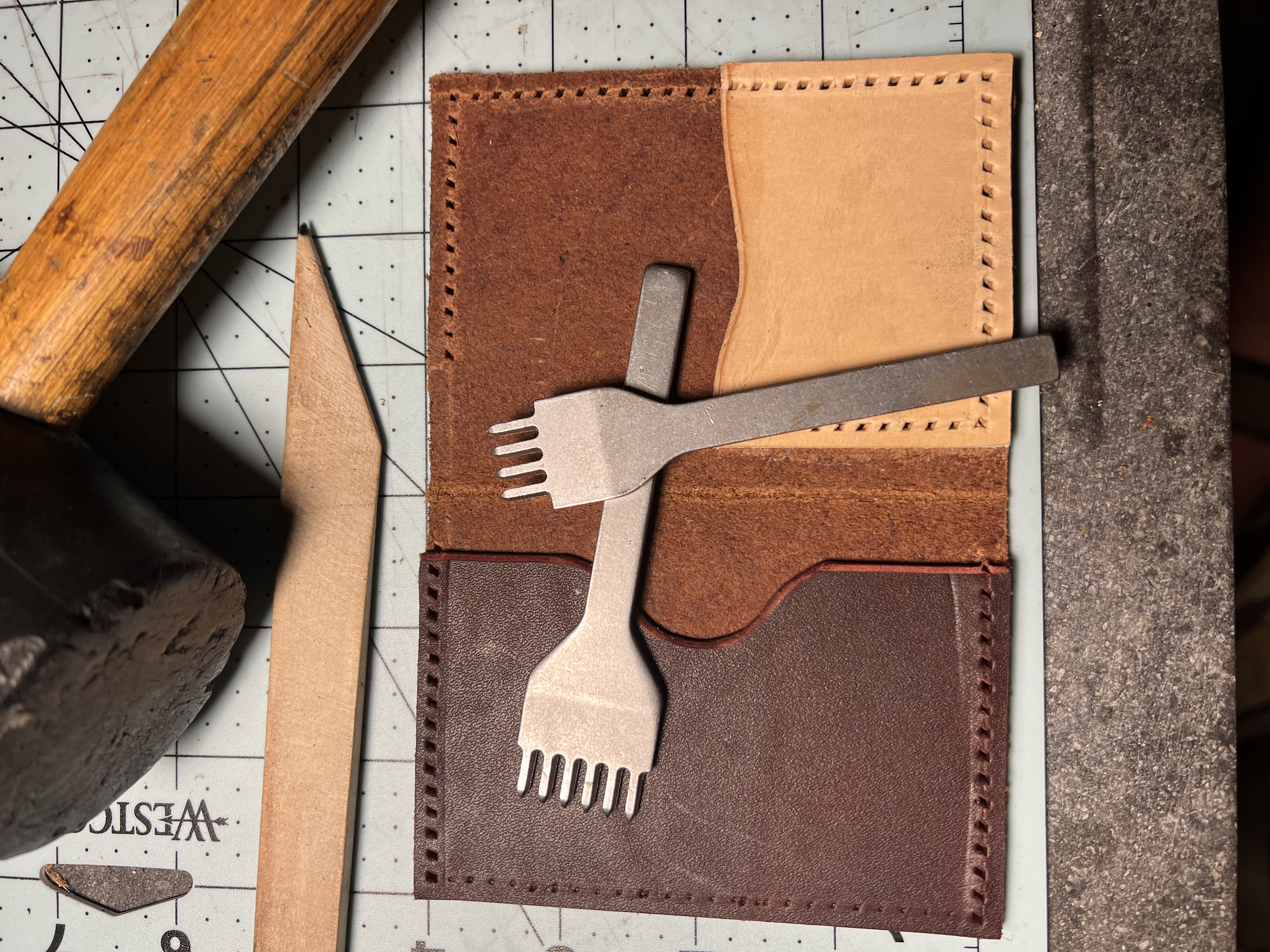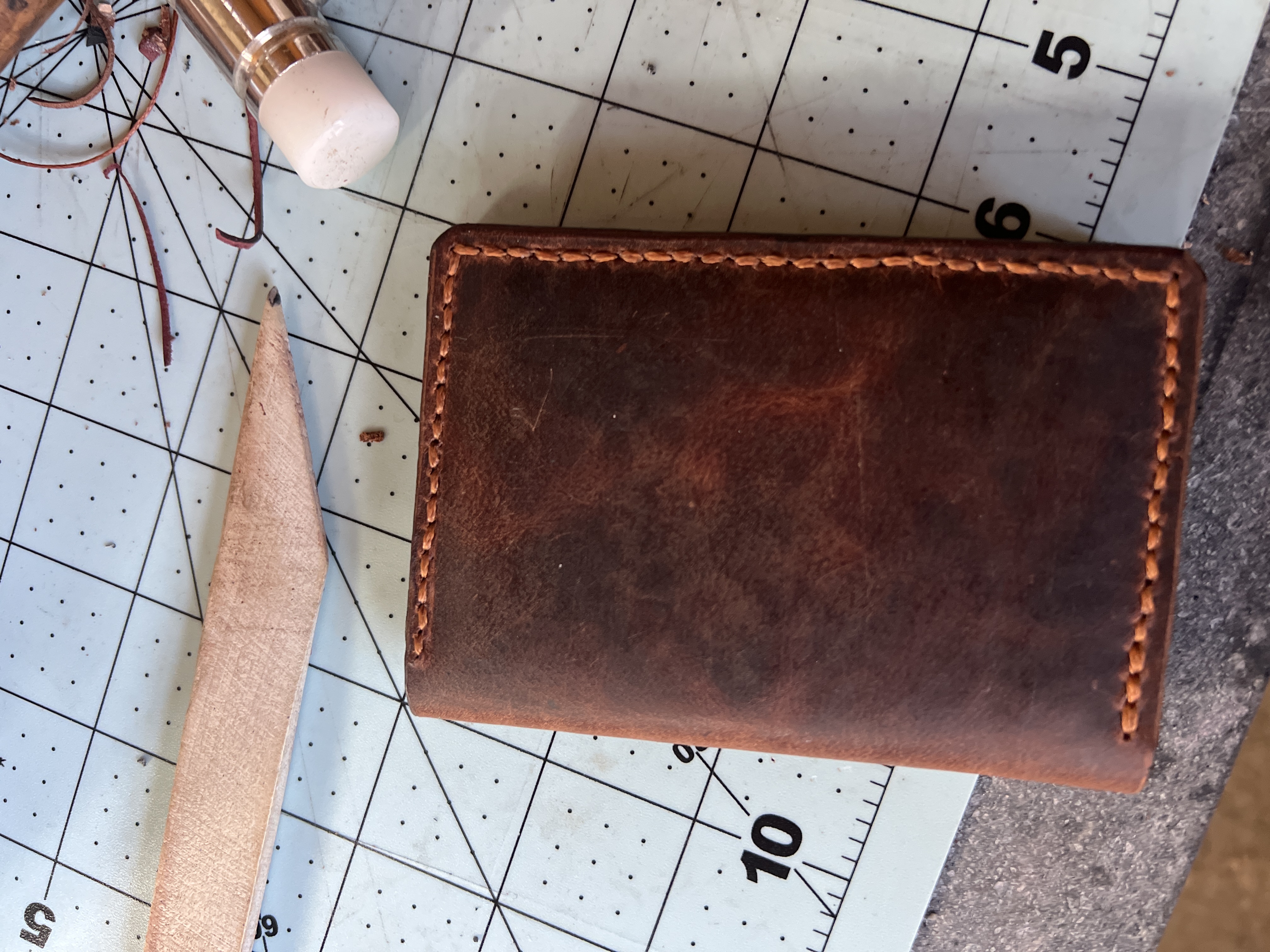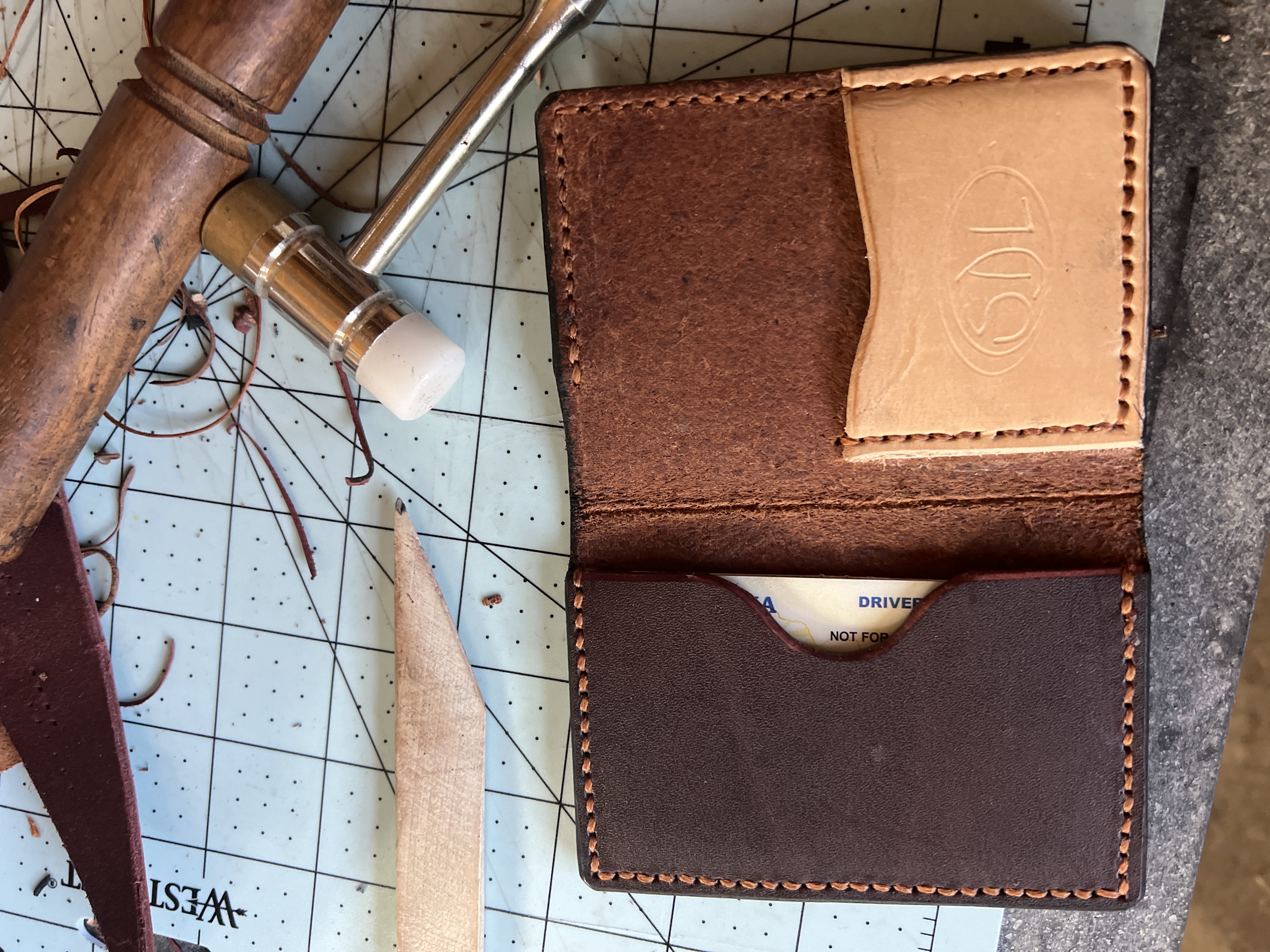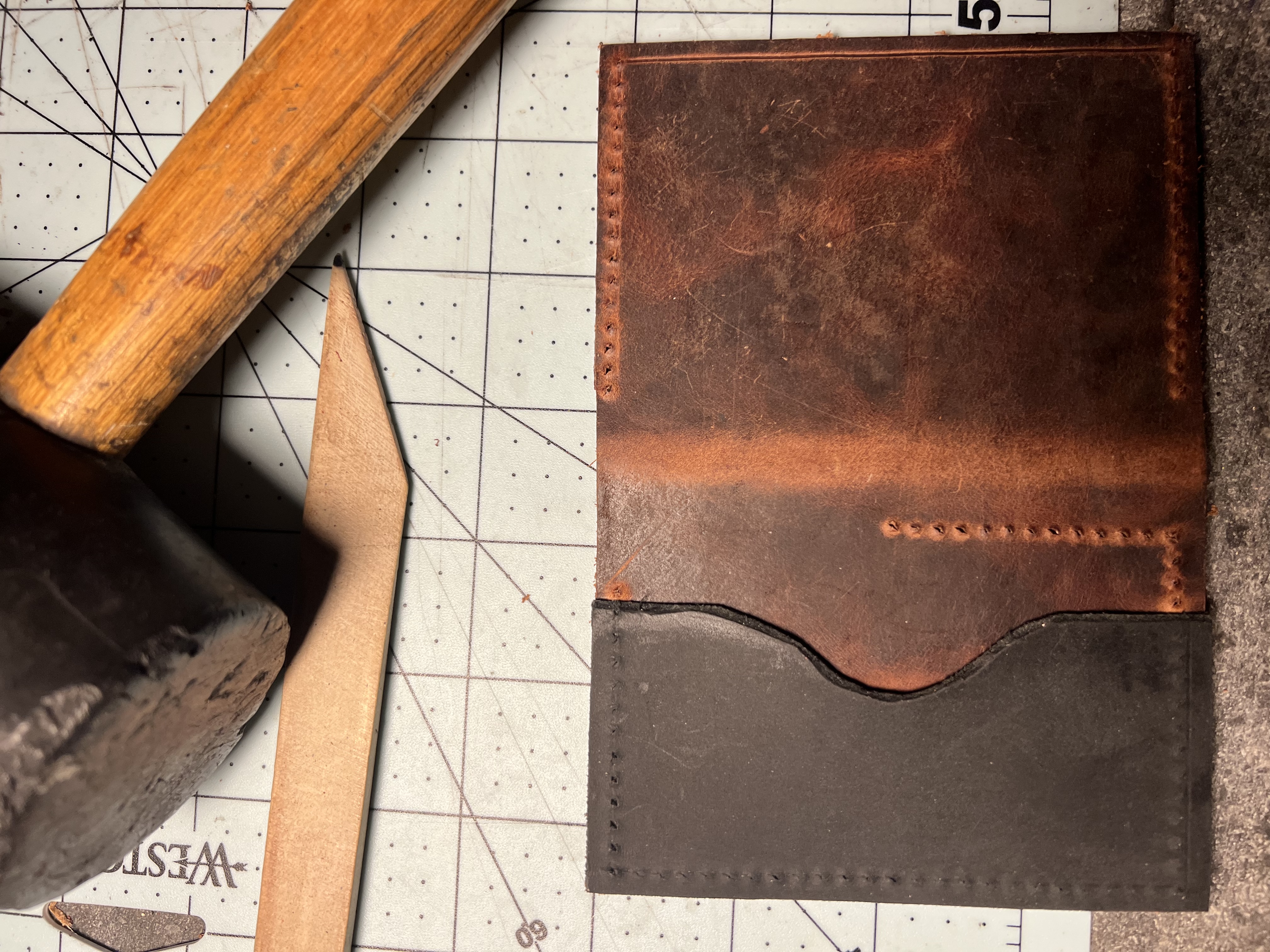 Hi everyone. Here is my first wallet. I struggled a bit over the design, but I think it is good. I used a 5oz leather for the outside and the outside pocket. The inside half pocket is a 3oz. And my id pocket is made from a 5oz latigo leather.