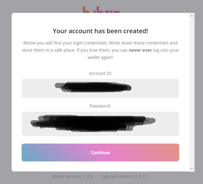 - Your account has been created! Write down these credentials and store them in a safe place. And push “Continue”