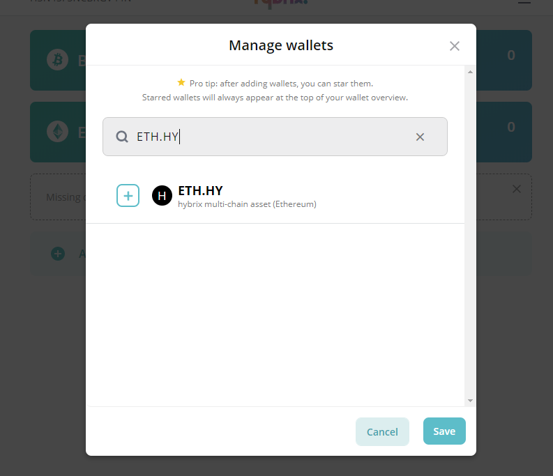 Push “Add wallet”, find ETH.HY and push “+” and “Save”
