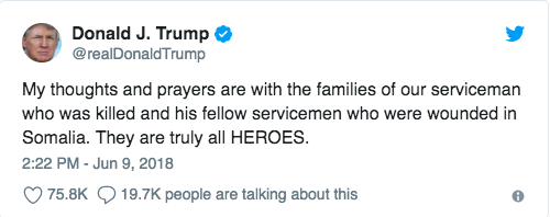 Yesterday President Donald Trump tweeted, "My thoughts and prayers are with the families of our serviceman who was killed and his fellow servicemen who were wounded in Somolia. They are truly all HEROES." Three hours later he tweeted it again, this time with the correct spelling of Somalia.