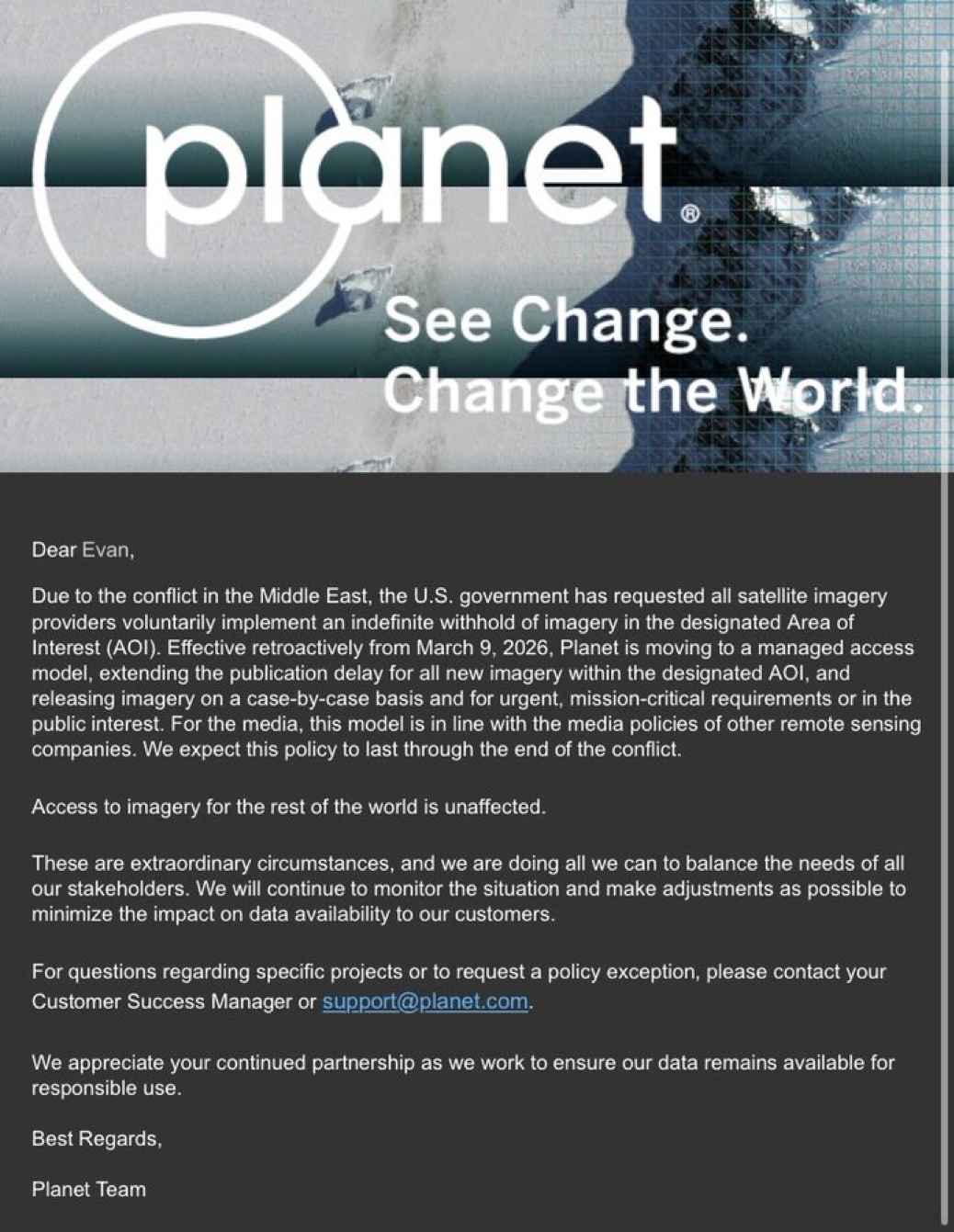 Warhaejin (89)in #war • 22 days ago One of the most important US-based commercial satellite imagery providers on whom most media outlets rely says the government has asked all imagery providers to indefinitely withhold satellite images from the Iran war