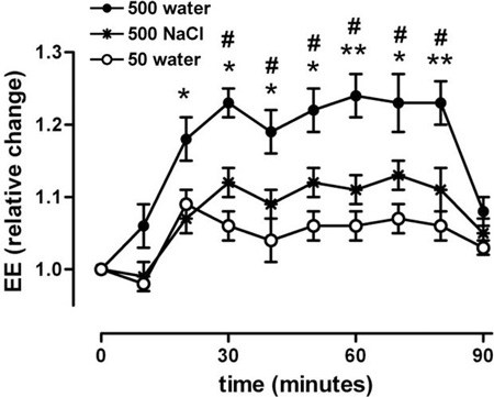 The image below shows this effect. The top line shows how 17 ounces (500 ml) of water increased metabolism.