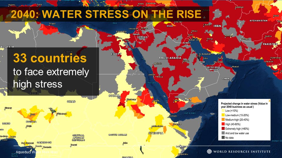 This can be said for government's around the world, particularly those in the 33 countries that the World Resource Institute estimate will experience extremely high water stress in 2040. The impacts of conflict and migration are not contained within borders, however, and this pattern will continue to threaten the security of a large proportion of the global population.