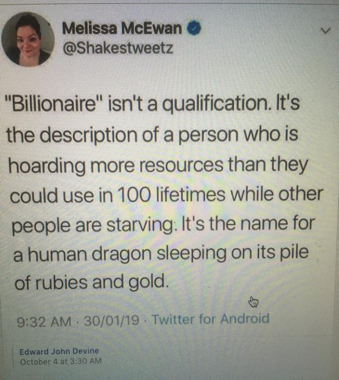 Came across a screenshot of a woman criticizing wealthy people. And... I strongly disagree. 😌 Melissa McEwan that wrote that clearly does not understand wealth creation. No rich person has millions - not to say billions - just laying idly around. That money is working somewhere in some way, no matter how.