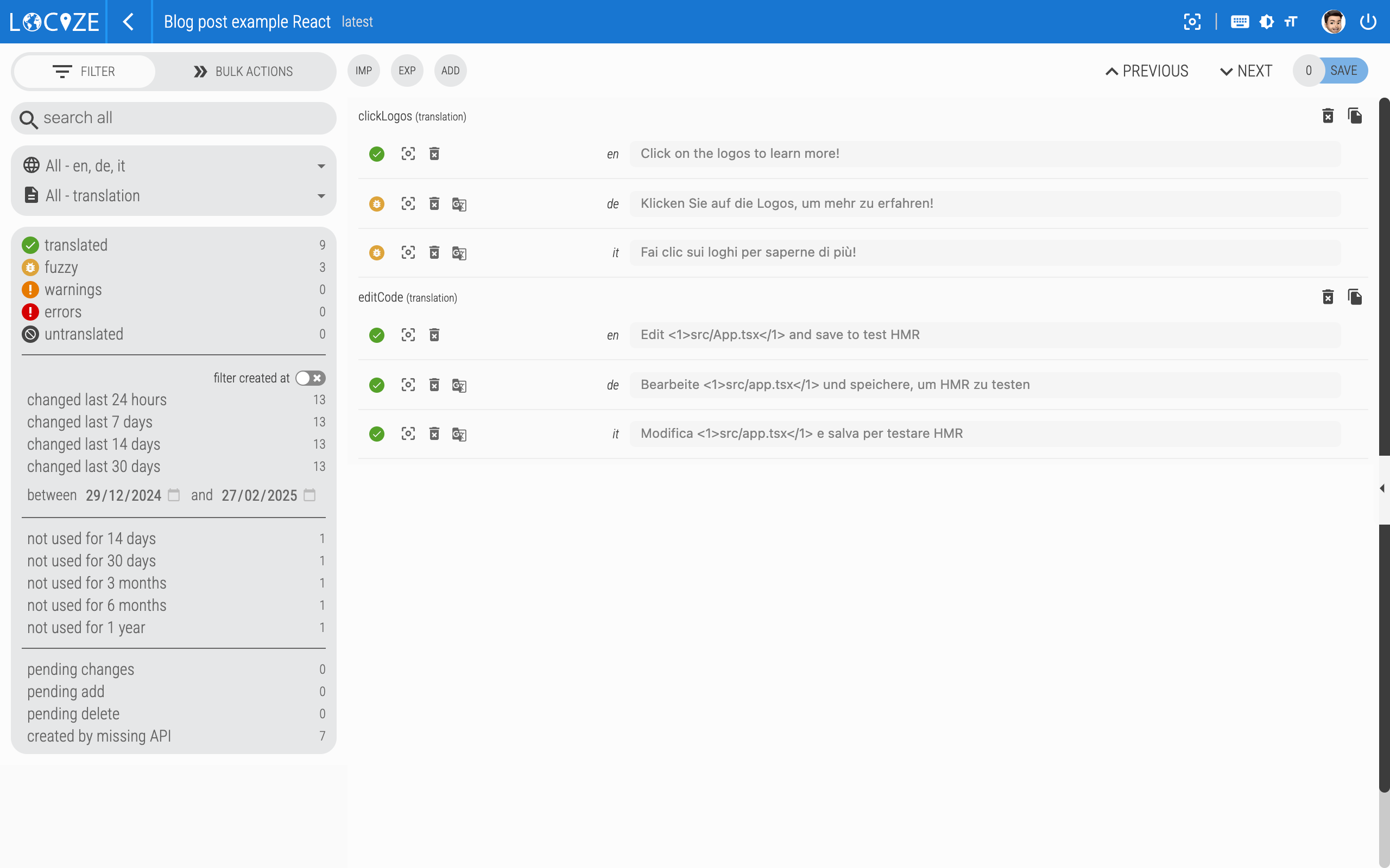 Thanks to the locize-last-used plugin, you'll be able to find and filter in locize which keys are used or not used anymore.