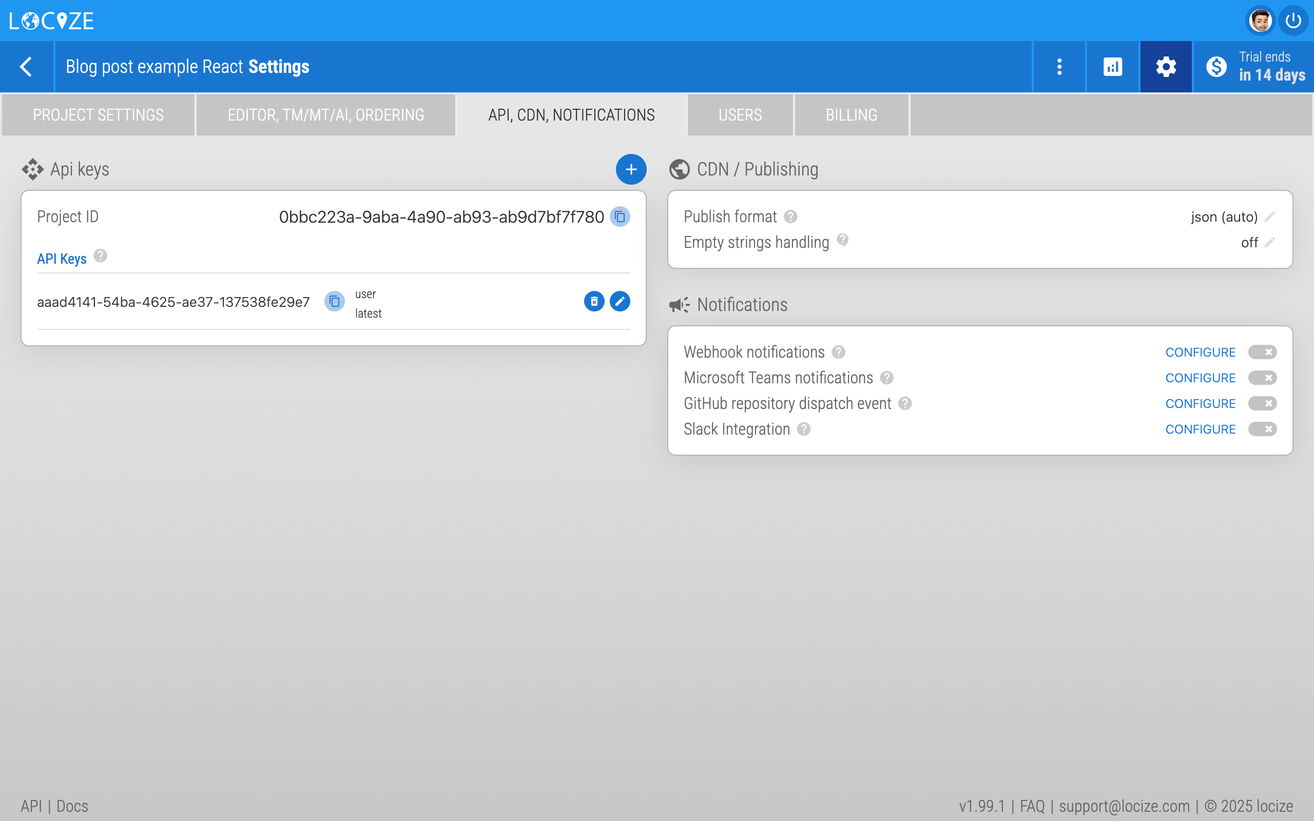 First you need to signup at locize and login. Then create a new project in locize and copy your project id and api key to your env files in your project. The api key is only used for the save missing and the last used functionality.