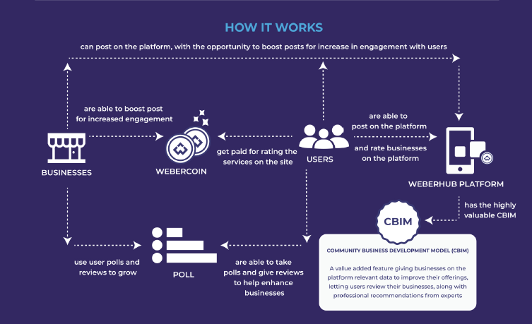 WeberCoin là 1 token thúc đẩy sự phát triển của WeberHub bằng cách kết nối các doanh nghiệp với người dùng trên nền tảng dễ sử dụng, thưởng cho họ để tương tác trên nền tảng, tất cả trong hệ thống mạng quảng cáo. Việc Token được sử dụng trên nền tảng này cũng như các token được sử dụng rộng rãi khác, các doanh nghiệp kết nối với khách hàng tốt hơn và đồng thời khách hàng sẽ nhận được phần thưởng khi sử dụng nền tảng này. Từ đó doanh nghiệp có quyền tạo ra dịch vụ sản phẩm tốt hơn cho khách hàng tiềm năng của mình vì sự tương tác cao sẽ làm 2 bên hiểu nhau hơn.