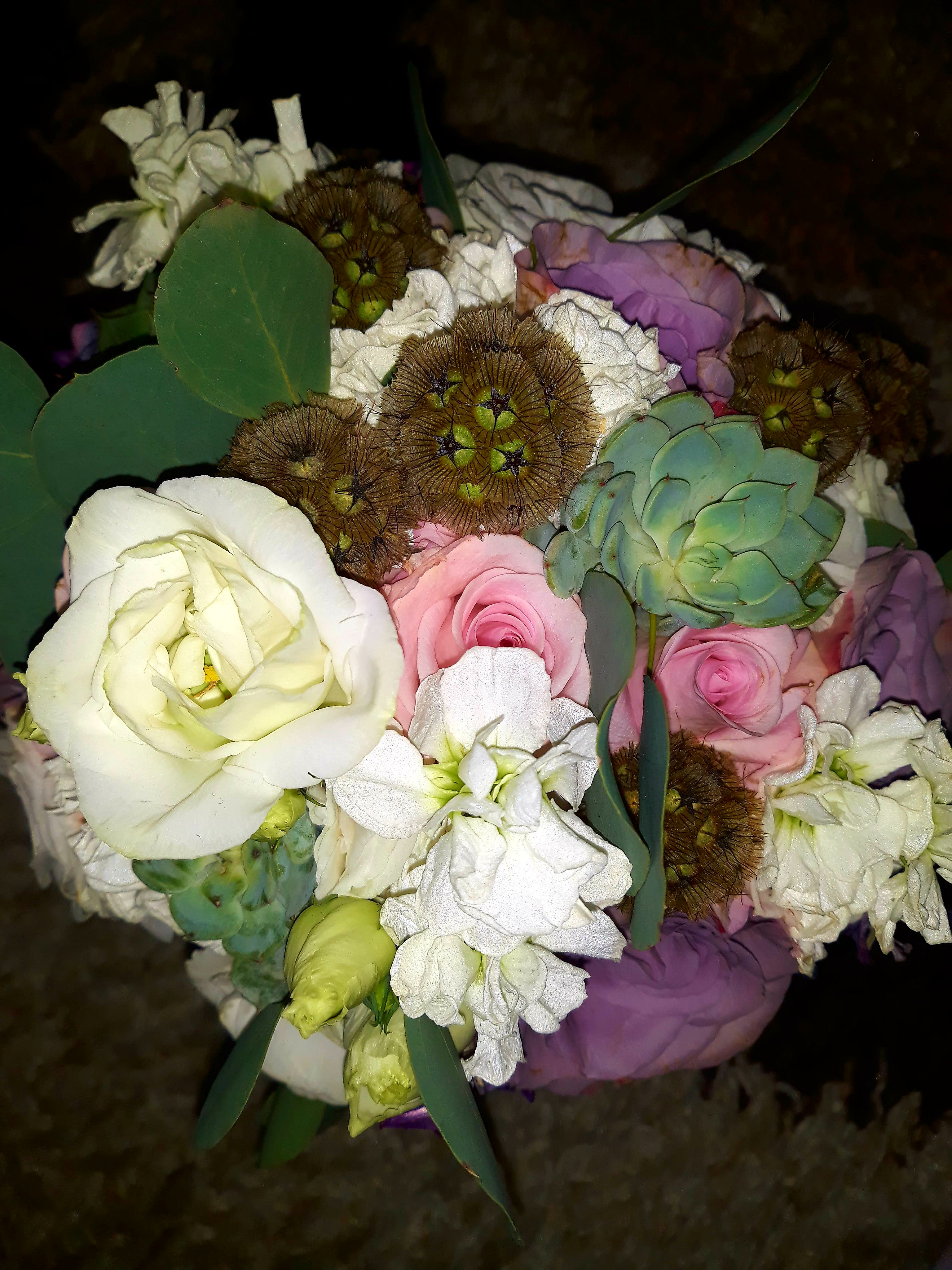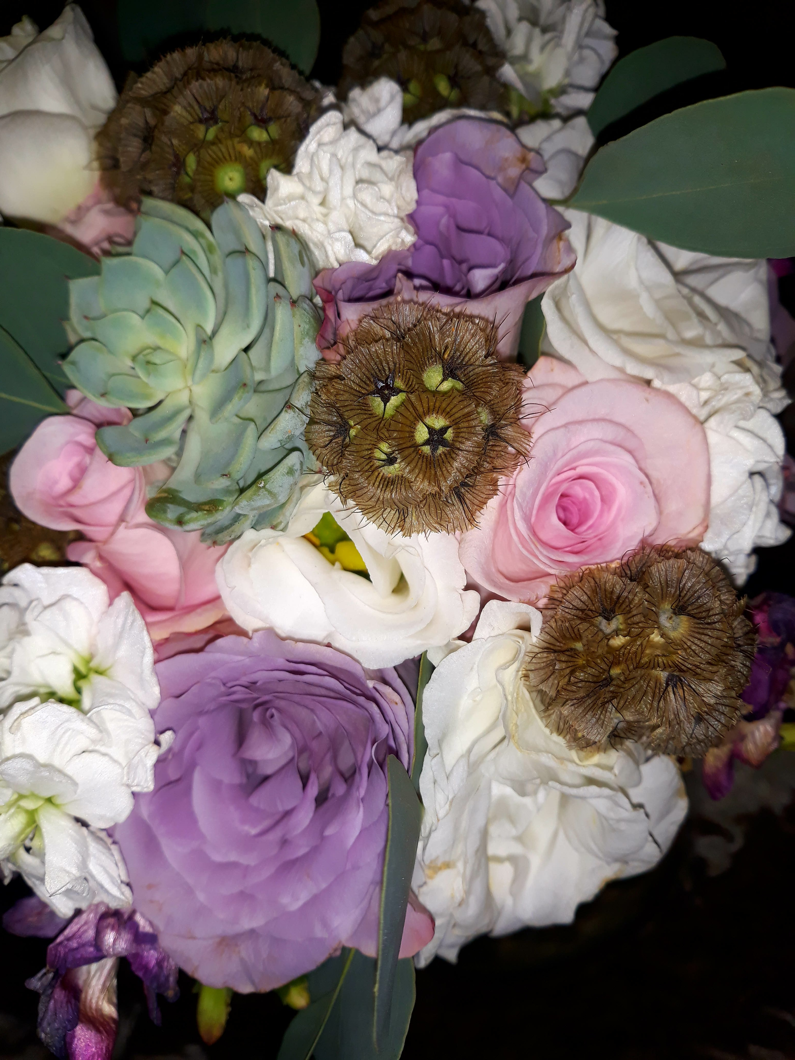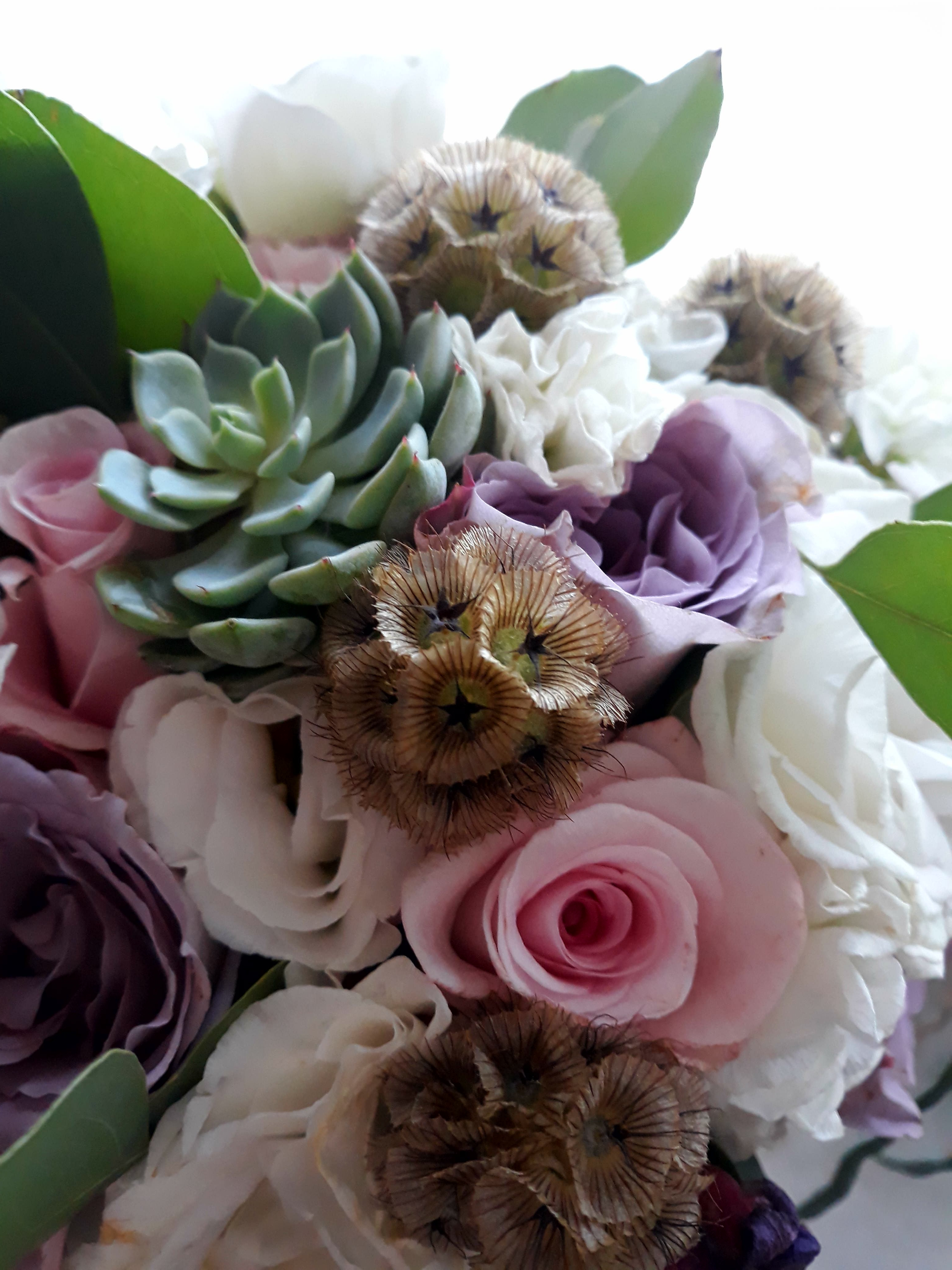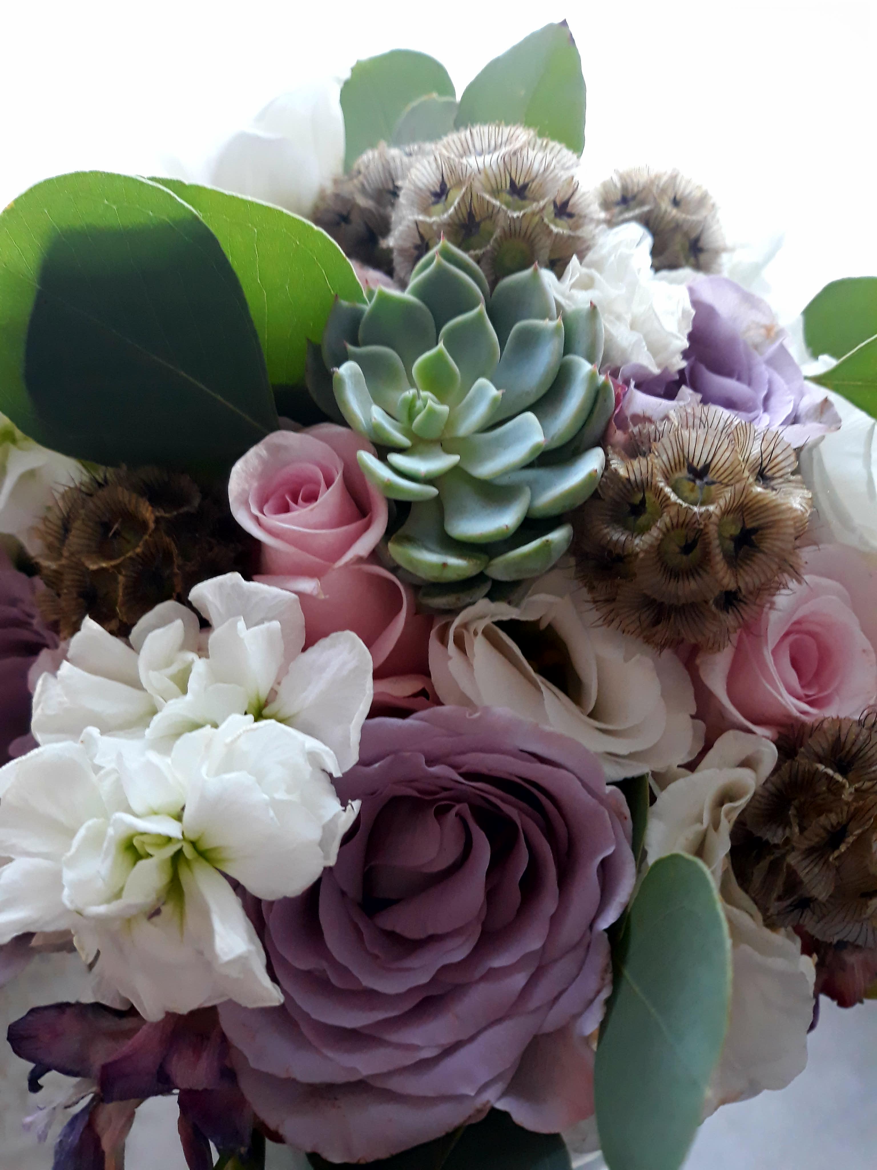 David Austin roses – the lilac and purple symbolize enchantment and love at first sight while the pink symbolize gratitude, appreciation and admiration