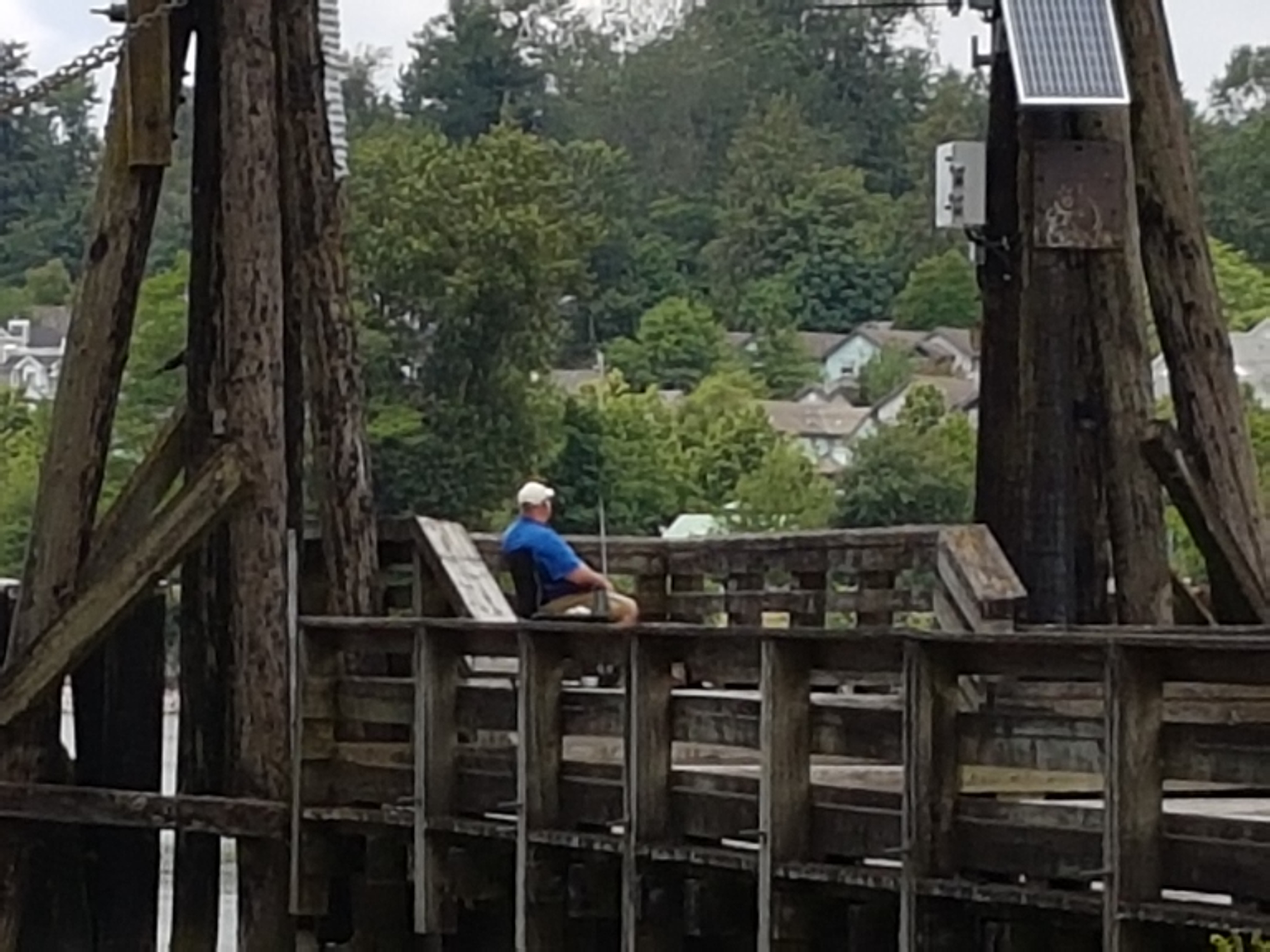 Suddenly I saw a man all alone sitting on a chair on the bridge. He was fishing there and enjoying the weather.