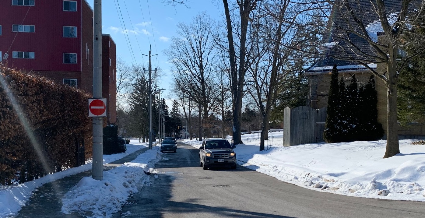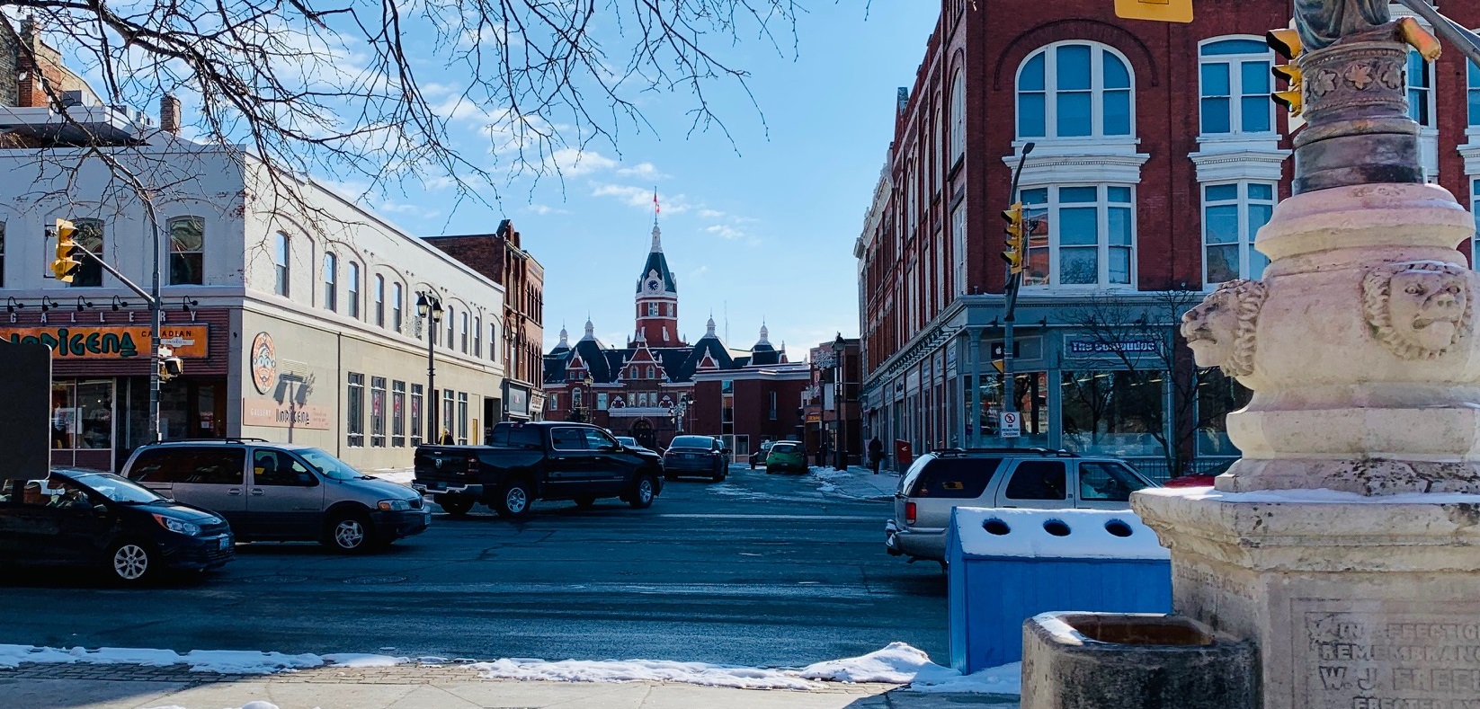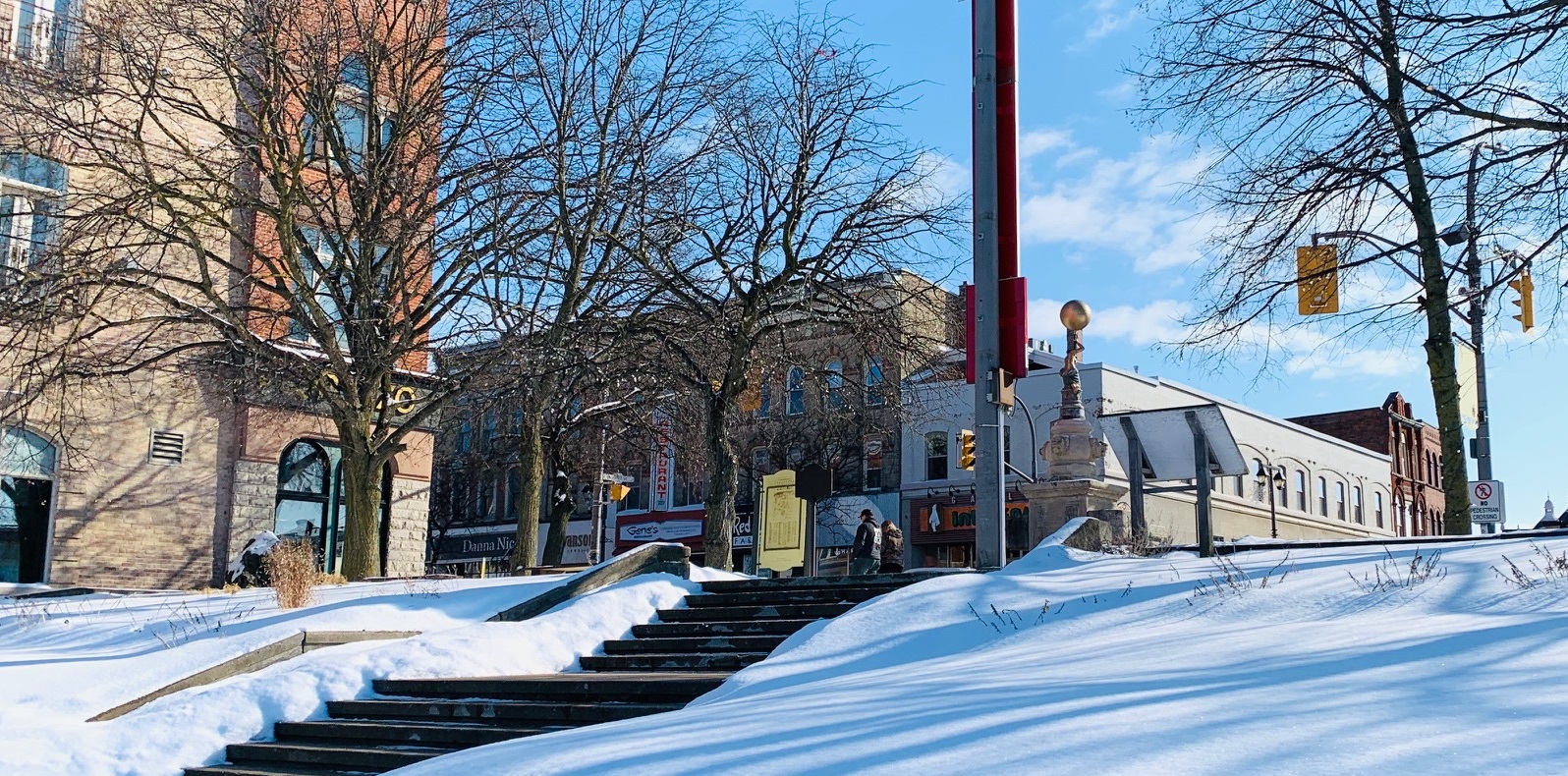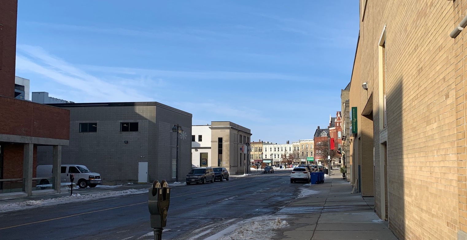 A couple streets perpendicular to the main street, the sidewalks and roads are a little thinner as you head back east toward the square. The depths of this shot is probably 500 meters or so with plenty of pubs, cafes, the corner of city hall, banks and other businesses in the downtown core. Pretty peaceful on the sidewalks this time of year or perhaps they are at the pub where it is warm, friendly and delicious.