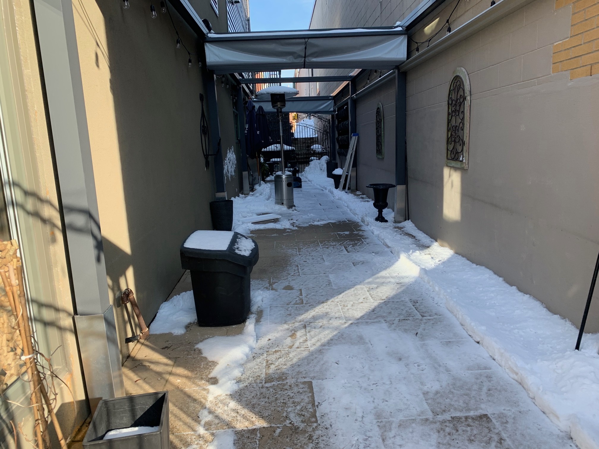 Almost to the pub, you get a shot of the side court of a restaurant that has packed up for the winter. This is a nice space with flowers, tables and chairs in the summer at a place you can get some good comfort food, a little South African influence @jaynie may like and a little craft beer. I won't name it because I think the owner is a dumbass ignoramous and there are a dozen places better than this within 60 seconds walk.