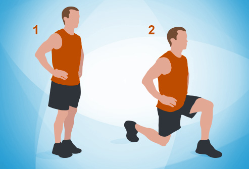 Remain with your feet together. Advance forward on your correct foot, dropping your pelvis down toward the floor (not forward), bringing down yourself until both front and back knees are bowed as near a 90-degree edge as would be prudent. At that point push back with the front leg and come back to your beginning position. Switch legs. Rehash for 30 seconds. You can make this all the more difficult with turn around lurches, or make it less demanding by not bringing down your body as profoundly.
