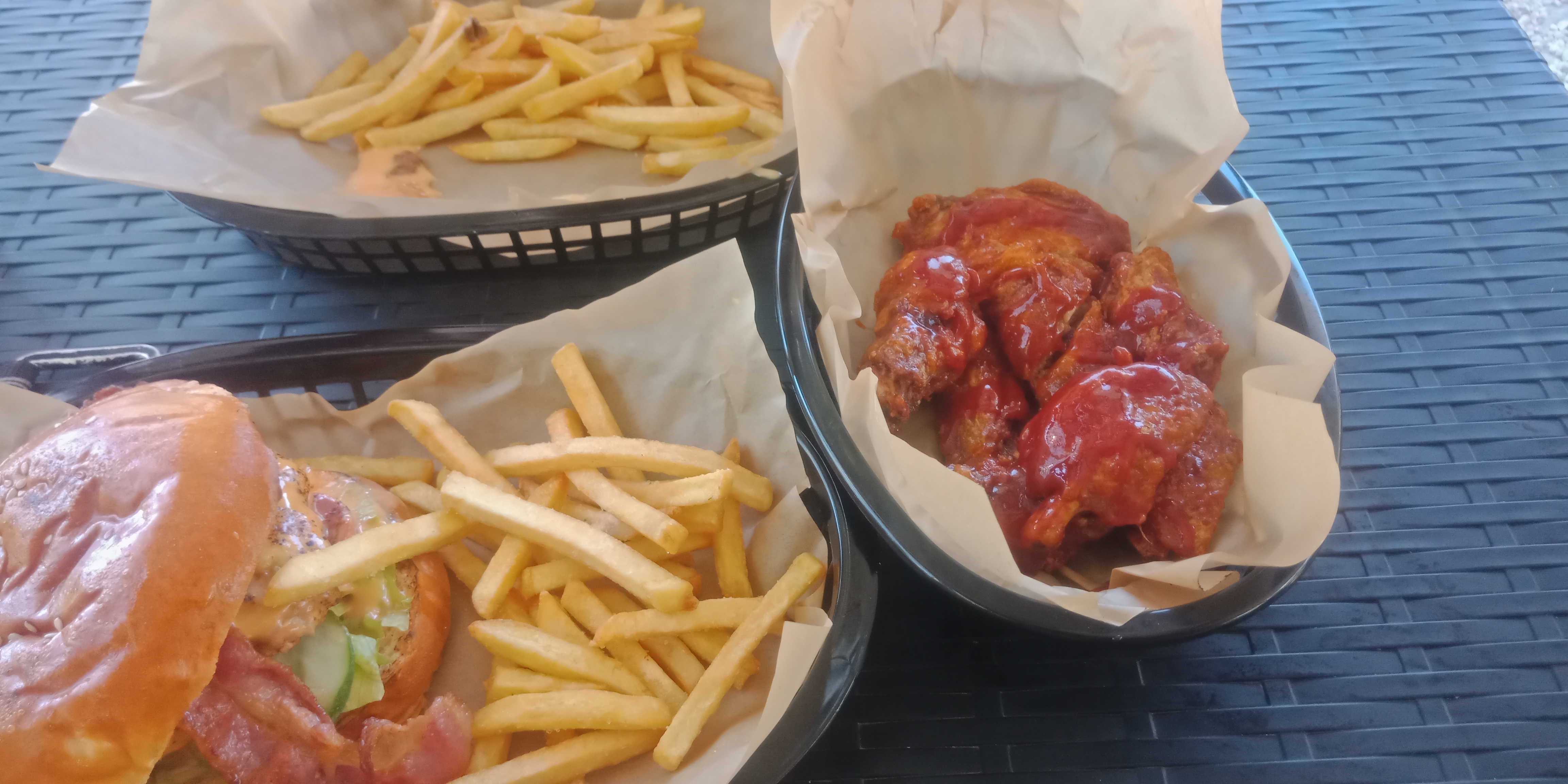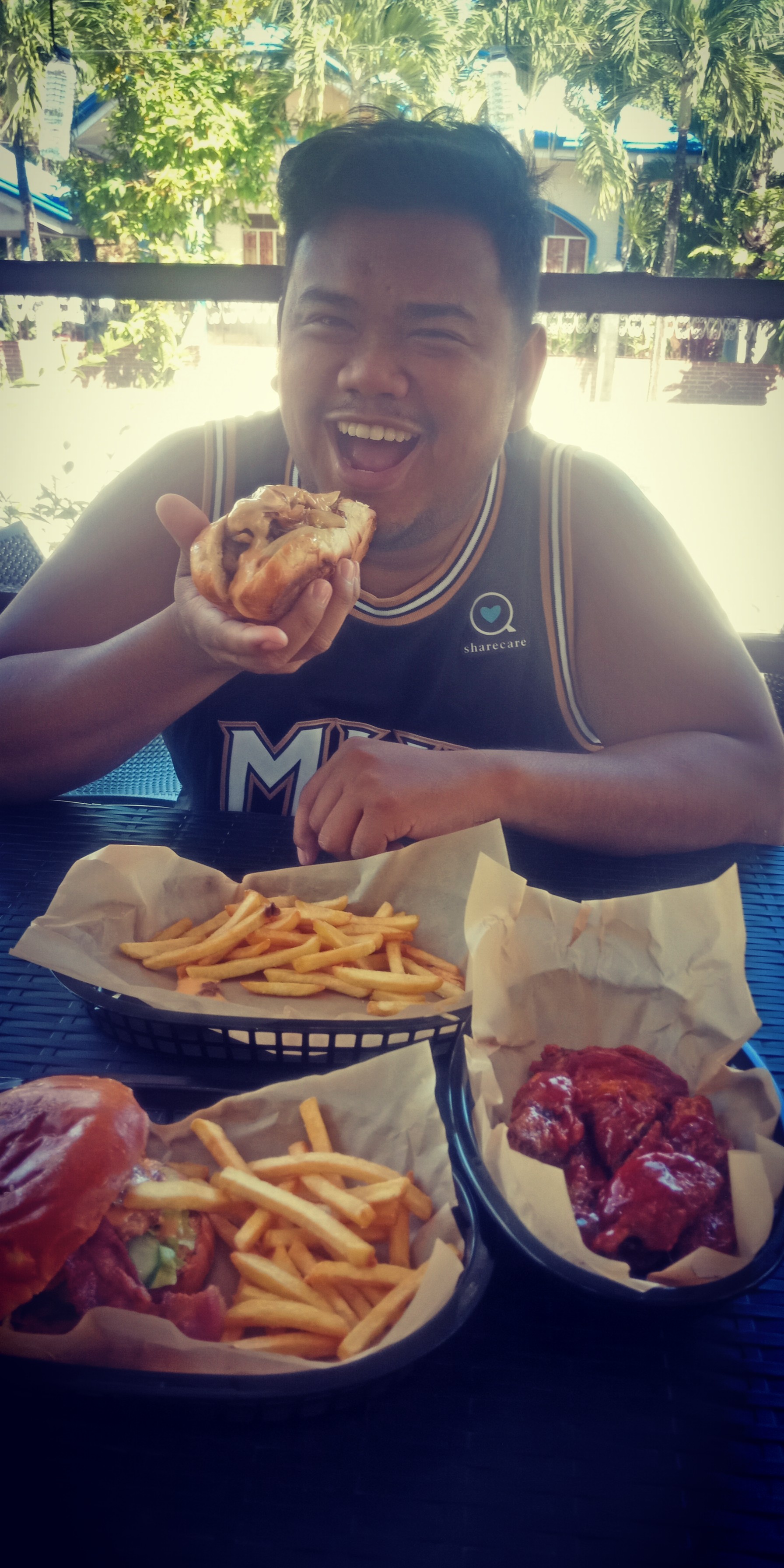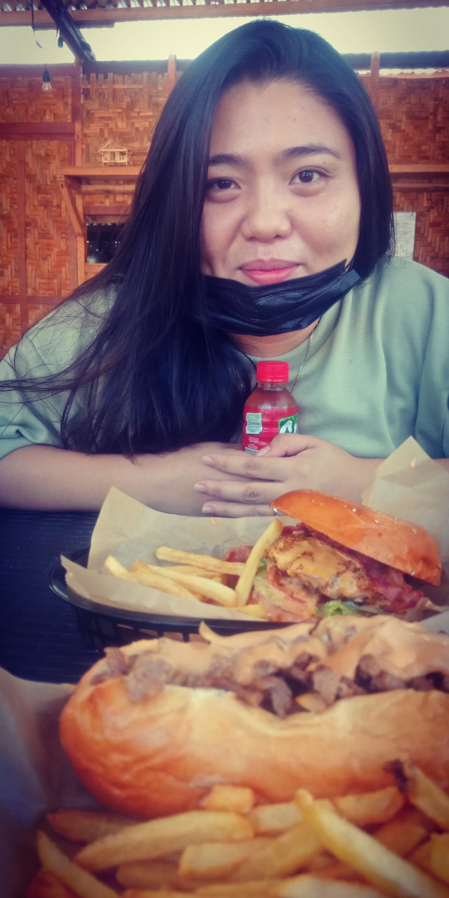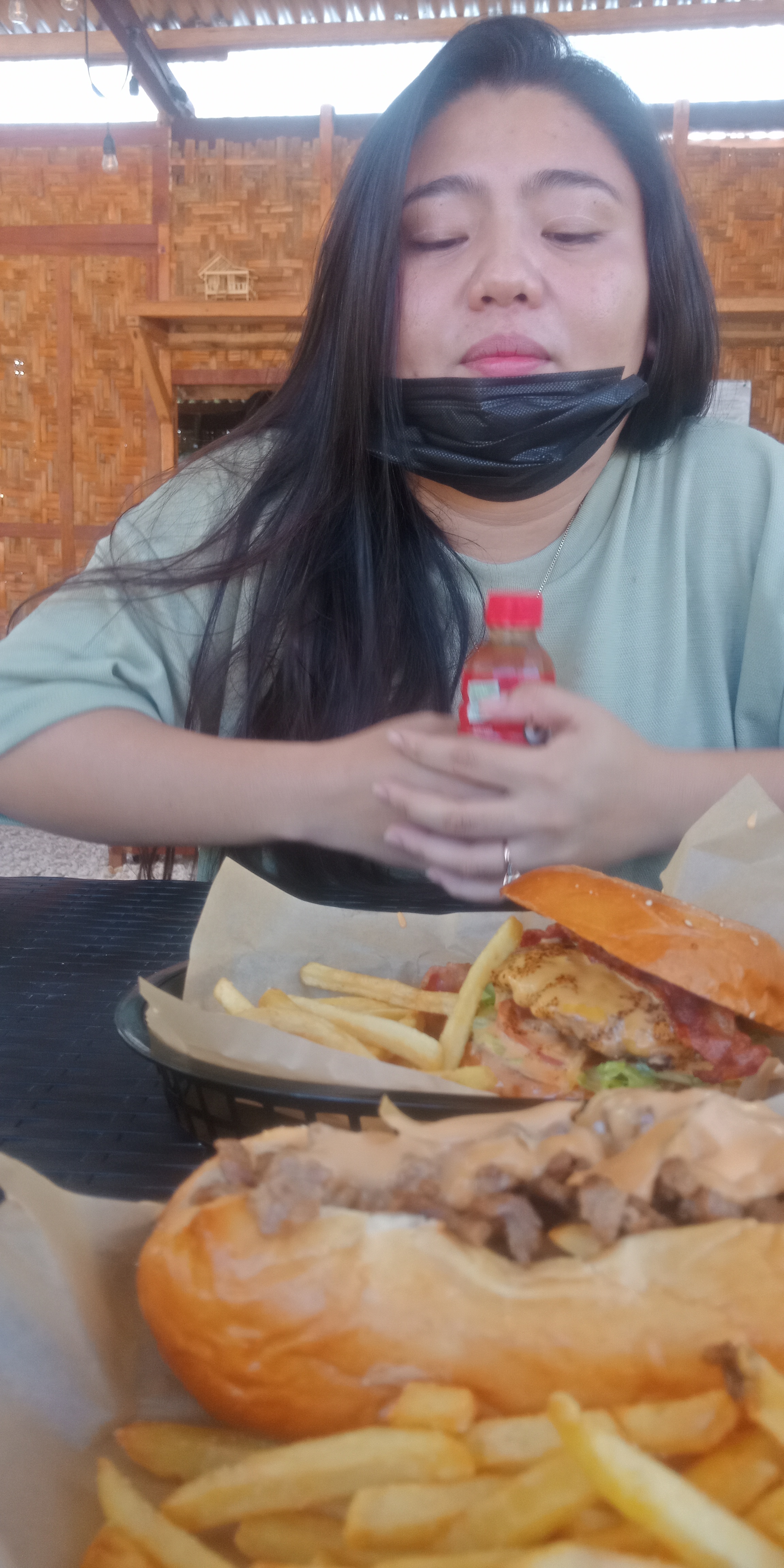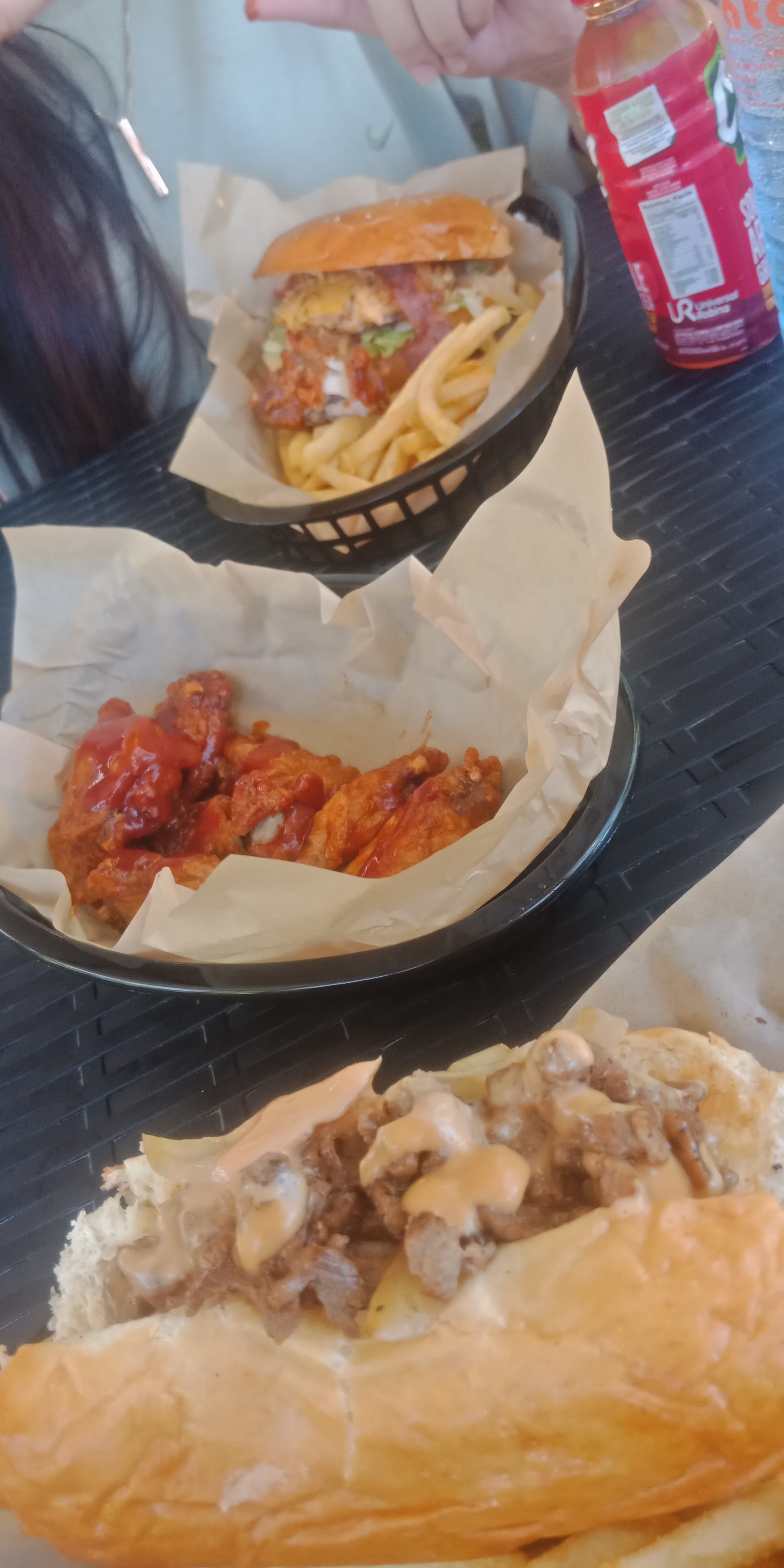 It is me and my girlfriend eating a our favorite burger anf sandwich hub here in out place. There storw is callee backyard burgers and sandwiches. Very satisfied and full.