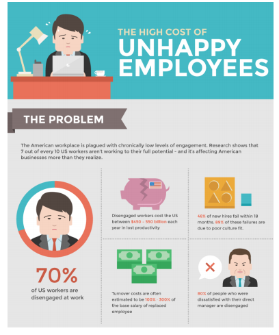 The things which we see as common problems are the things which are destroying us the most, the less attention we pay to it the more damage it is causing to us secretly. According to research the US unhappy workers who are employed in 1 or various companies cost the U.S. itself between $450 and $550 billion in lost productivity each year, and that 7 out of 10 US workers aren’t working to their full potential. And this is a global problem. Even 87% of C-Suite executives recognize that disengaged employees are one of the biggest threats to their business. Come to think of the great damage it is causing the US government talk more of other countries across the globe, if this problem is being eliminated and this money is channel to development, it will go a long way in most under developed countries.