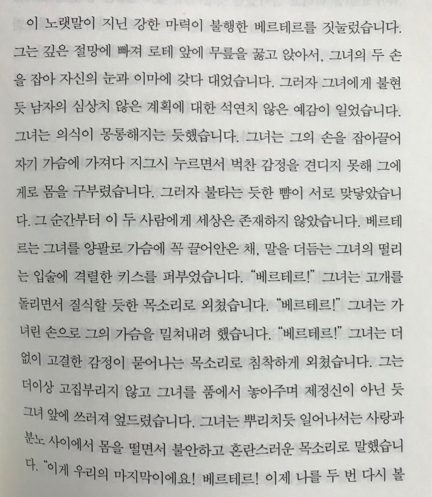 베르테르의 자살 이후 로테의 충격은 이루 말할 수 없었겠지만, 소식을 듣고 쓰러졌다는 것 이외에는 서술하지 않는다. 그런 생략이 로테의 애틋함을 잘 표현한다고나 할까.