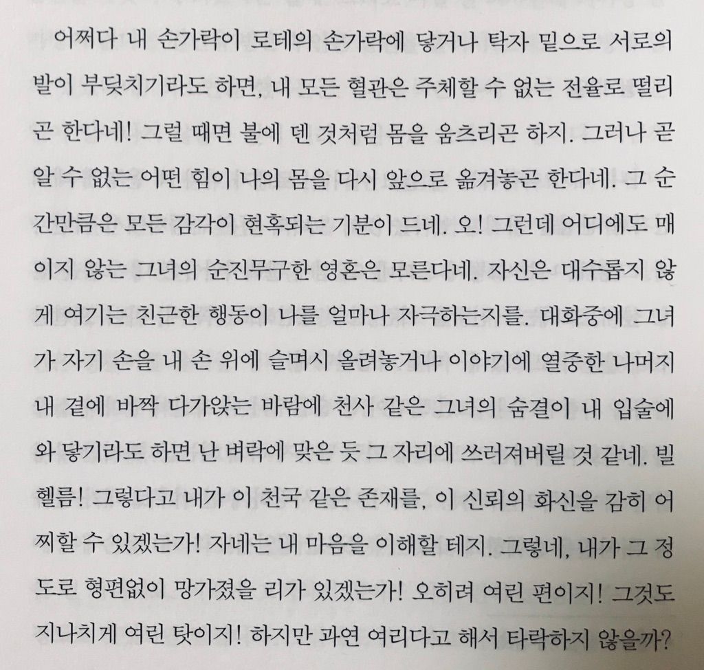 문학을 포함하여 예술은 그 시대를 반영한다. 지금이라면 자살로 마무리되는 소설로 지구적 감동을 이끌수는 없겠지만, 당대의 유럽(및 중국/일본까지)에서는 약혼자가 있는 이를 사랑하며 이렇게 파국으로 치닫는 게 상상하긴 어려웠나 보다. 사랑과 고통의 표현은 사실 지금 봐도 절절함이 이를데 없다.