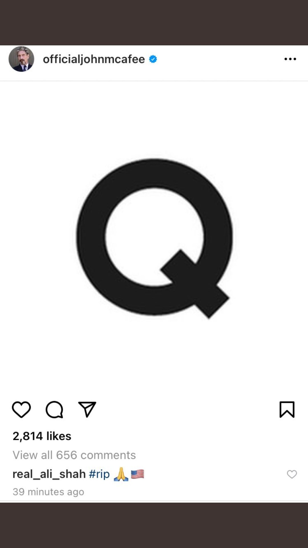 With a great deal of incredulity and sadness, we say goodbye to John McAfee. There is no point to mincing words. In all likelihood, McAfee was murdered in a jail cell in Spain. After his reported death, the letter 'Q' was posted on his Instagram account. His Instagram account was then quickly deleted, by whom and for what reason is unknown.