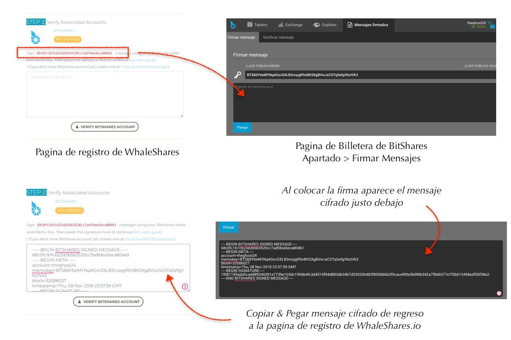 - Nos dirigimos a la pestaña abierta del registro de WhaleShares y colocamos esta información de la firma justo en la casilla "Verify Associated Accounts" debajo del "Paso 2" o "STEP 2" y presionamos el botón "VERIFY BITSHARES ACCOUNT" o que es lo mismo en español a decir "VERIFICAR LA CUENTA DE BITSHARES".