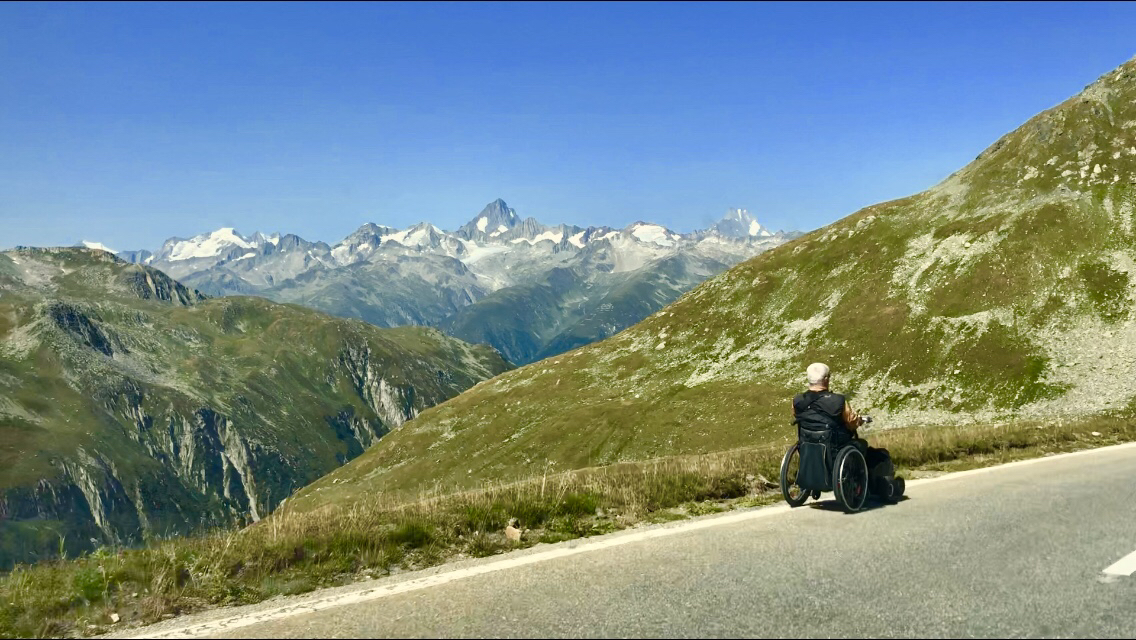 I just passed this man heading down the Nufenen Mountain Pass on a wheelchair!