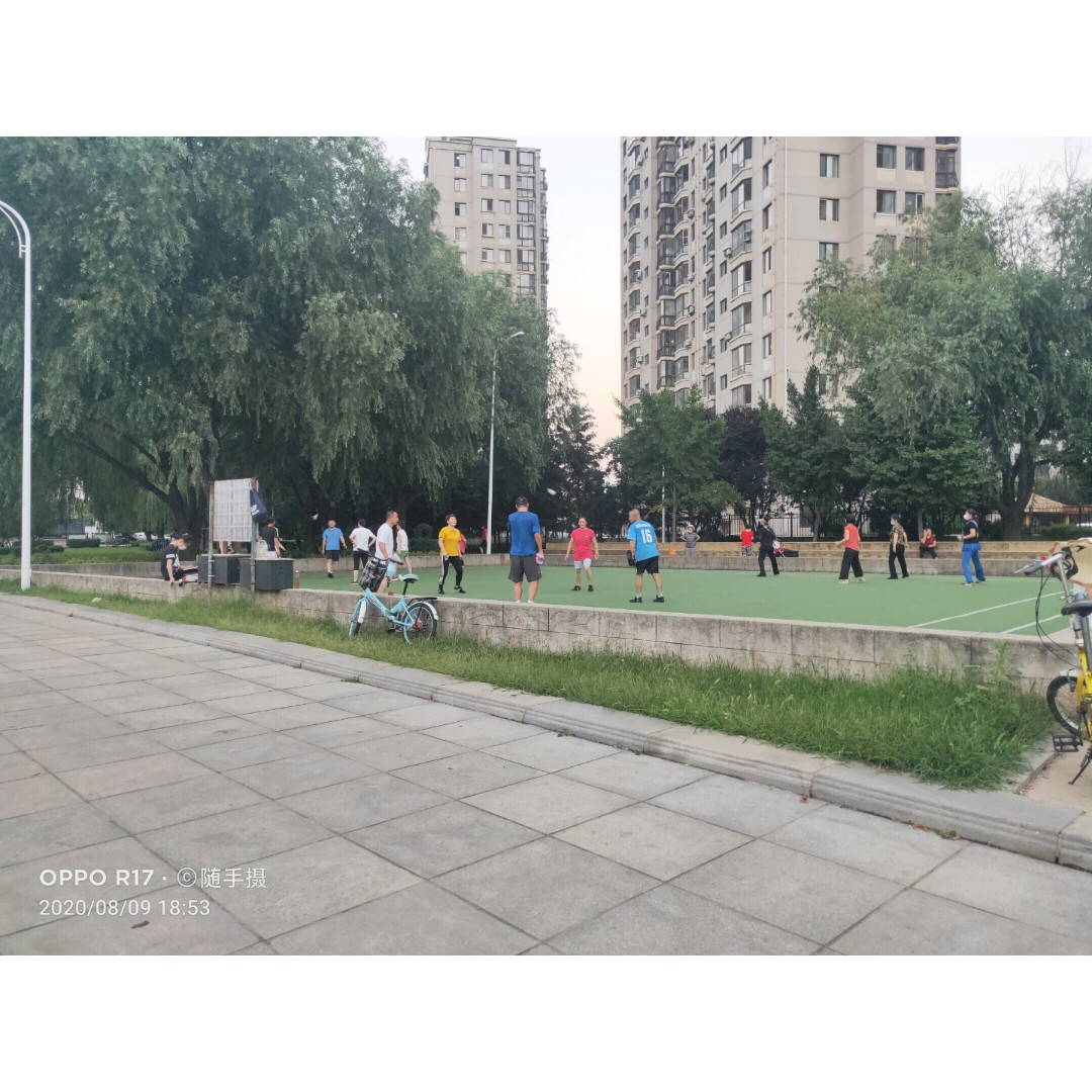 傍晚出来放风的人真不少,走步、唠嗑、踢毽子、打羽毛球,小孩子们玩球的、骑车的、滑滑板的也有。