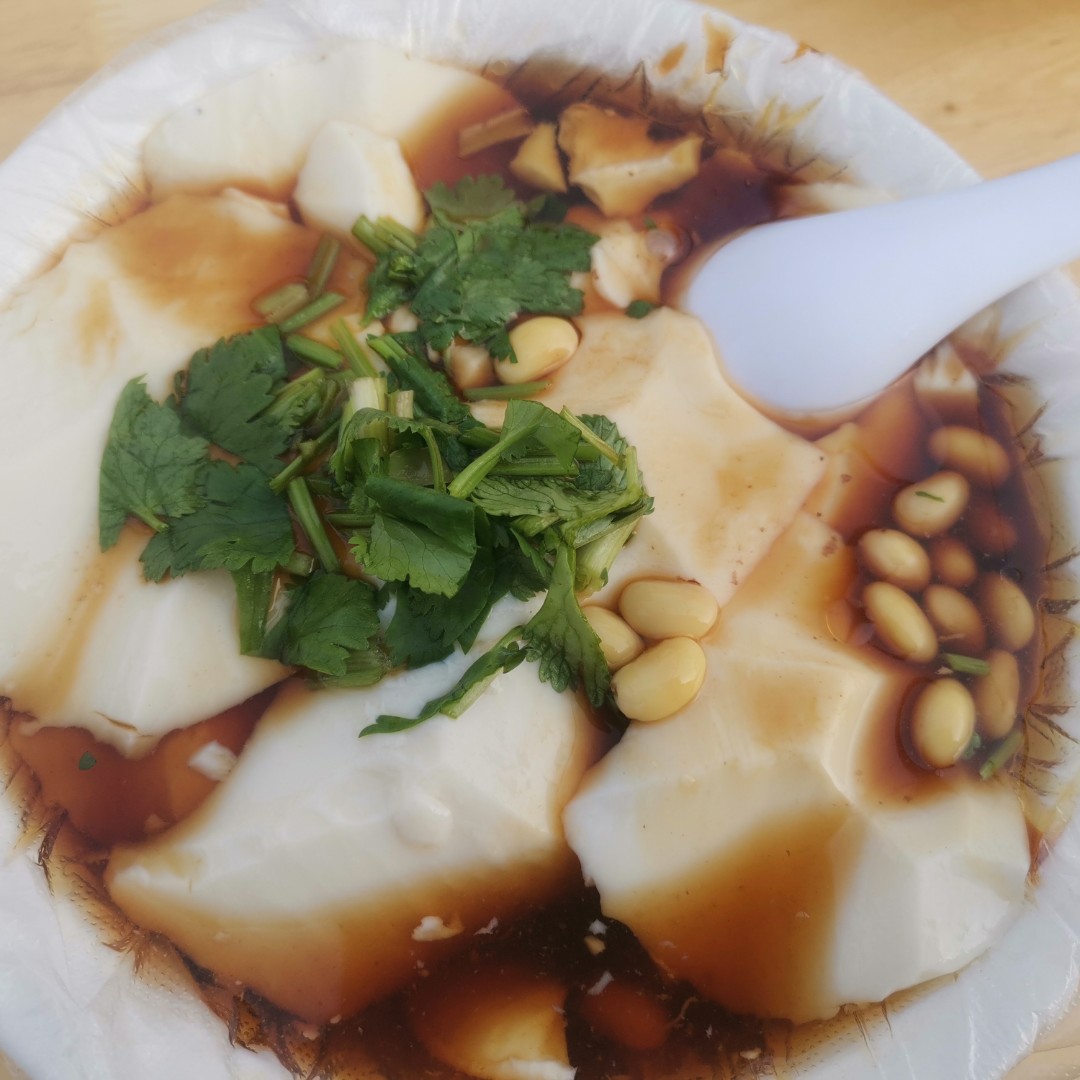 白嫩的豆花盛在纸碗里,颤巍巍的仿佛一碰就会化开,灵魂的卤汁顺着边缘缓缓流淌,深褐色的色泽看着就极具食欲。老板手不抖,配料给得超实在,圆润的黄豆吸饱了卤汁的咸香,咬起来粉糯回甘,再撒上一把切碎的翠绿香菜,青白褐三色交织,光是卖相就足以让人食指大动。
