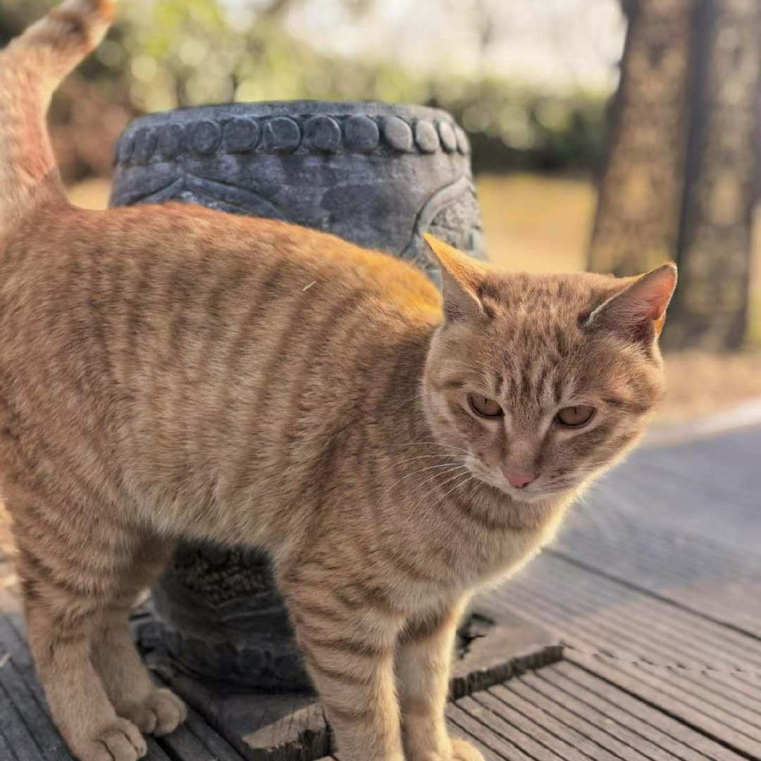 在古寺的木栈道上,偶遇这只橘色的小家伙。它就那样慢悠悠踱着步,尾巴高高翘起,像一面骄傲的小旗子,阳光把它的条纹染得暖融融的,连绒毛都泛着温柔的光。