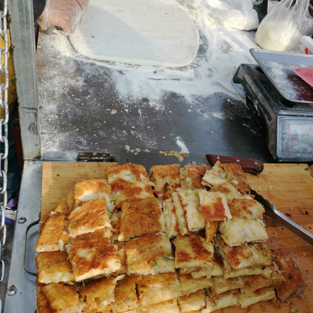 师傅戴着一次性手套,把醒好的面团擀得薄而均匀,撒上一把切碎的葱花,再层层叠叠卷起来,最后擀成大大的面饼。铁板上滋滋作响,金黄的油花慢慢浸透面皮,葱香混着麦香,在空气里飘出好远。