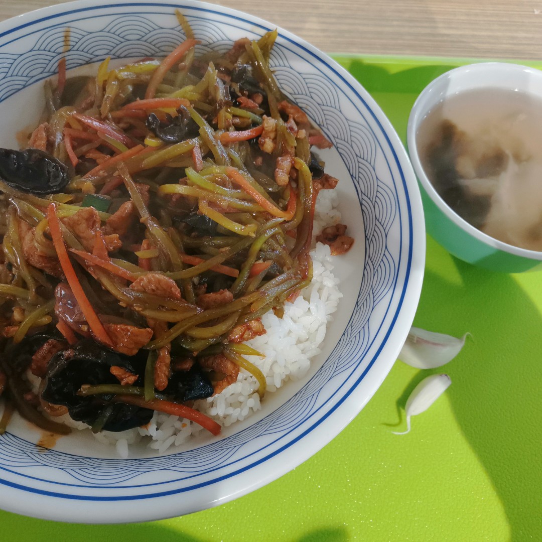 红亮的酱汁裹着脆嫩的笋丝、清甜的胡萝卜丝,还有吸饱了汤汁的木耳和肉丝,每一口都层次丰富。酸、甜、咸、鲜在嘴里炸开,配着粒粒分明的白米饭,连扒三口都停不下来。旁边搭配的紫菜蛋花汤清清爽爽,刚好中和了盖饭的浓郁,一口热汤入胃,瞬间驱散了上午的疲惫。
