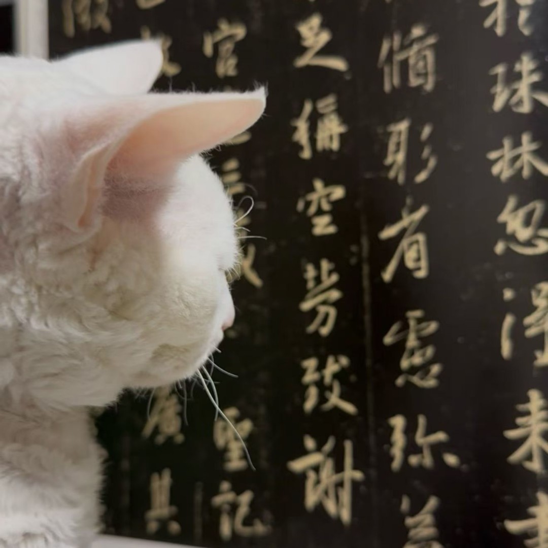 它软乎乎的白绒毛,衬着黑底金字的拓片,一下子就把千年的墨香和软萌的日常揉在了一起。碑帖上是唐太宗那句“善不足称,空劳致谢”的谦辞,它却好像完全不在意这些文辞深意,只是安安静静地陪着我,把满纸的魏晋风流,都看进了圆溜溜的眼睛里。