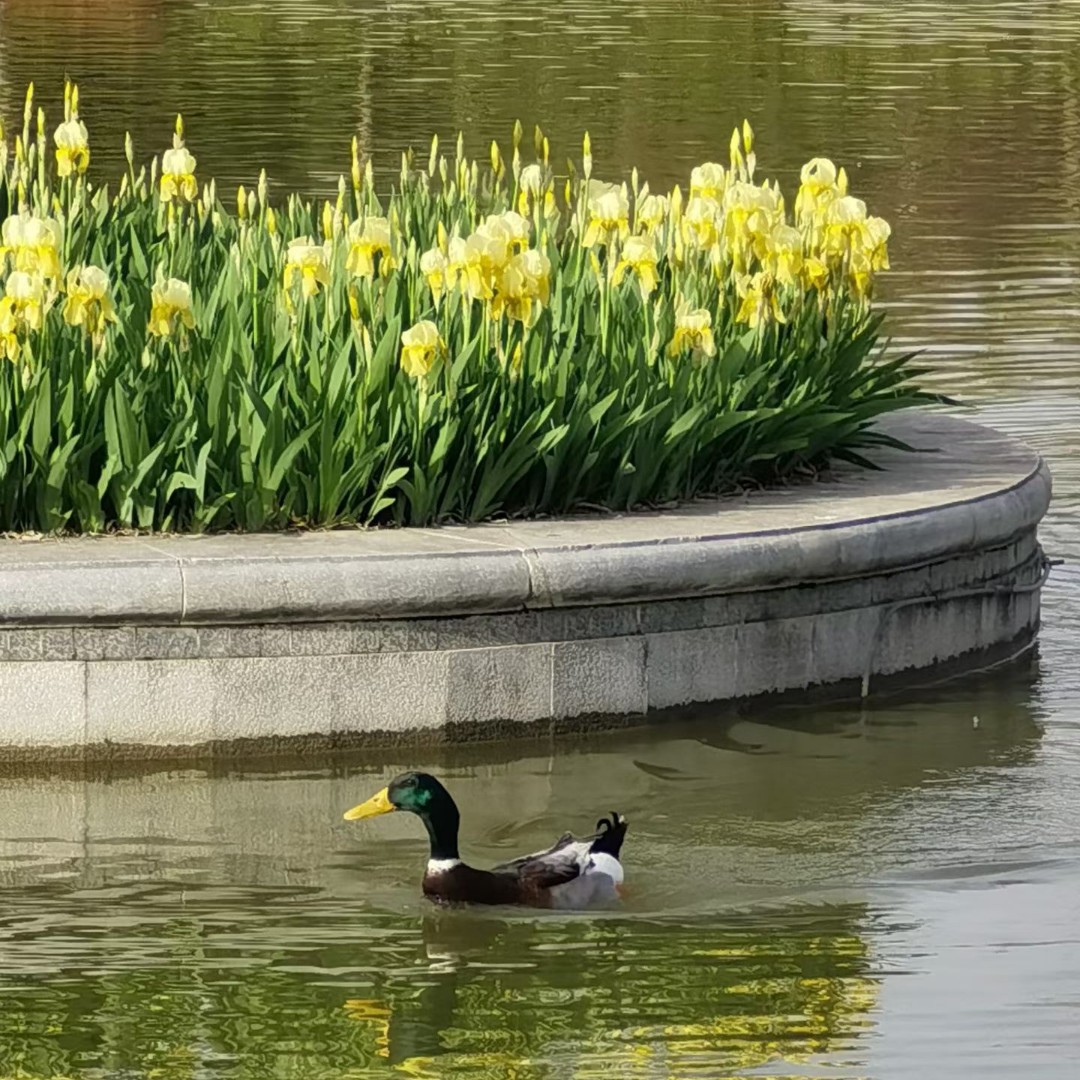 四月的风把暖意揉进了湖面,也叫醒了一池的温柔。石砌花台上,黄鸢尾正开得热烈,像攒了满枝的阳光,明黄的花瓣在风里轻轻晃,连带着水里的倒影都染成了软乎乎的金色。